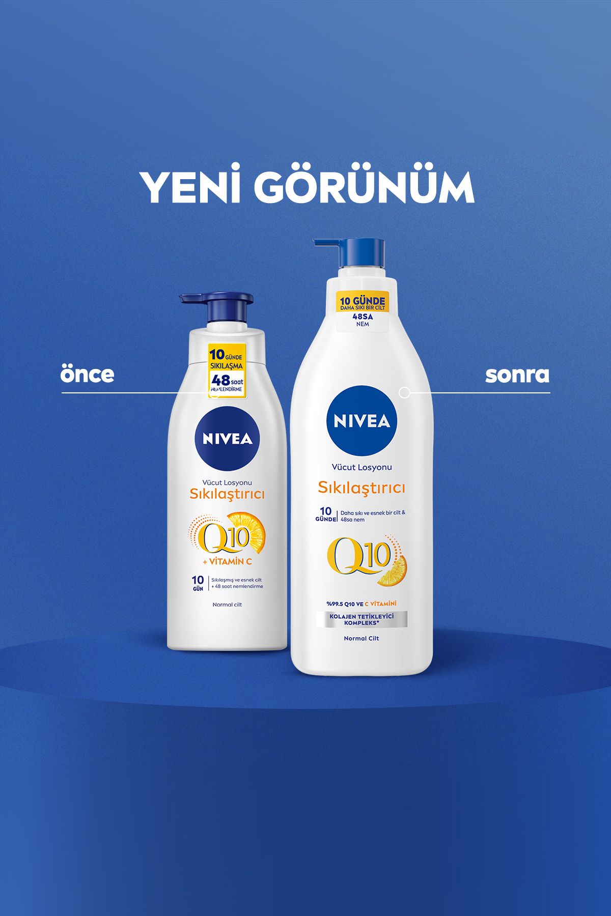 NIVEA® Sıkılaştırıcı Vücut Losyonu’nu deneyin! Güçlü formülü, hücre seviyesinde* daha yüksek etkinlik gösterebilmek için 3 aktif maddeyle zenginleştirilmiştir.; Koenzim Q10, Kreatin ve L-Karnitin içeren “Enerji Kompleksi” hücrelerin enerji seviyesini artırır.; Cildin doğal yapısında bulunan L-Karnitin yağ asitlerinin enerjiye dönüşmesini desteklerken, Koenzim Q10 hücrelerin enerji üretimini sağlar.; * Böylece Q10 Sıkılaştırıcı Vücut Losyonu hücre yenilenmesini destekler* ve daha iyi bir cilt görünümü sağlar.