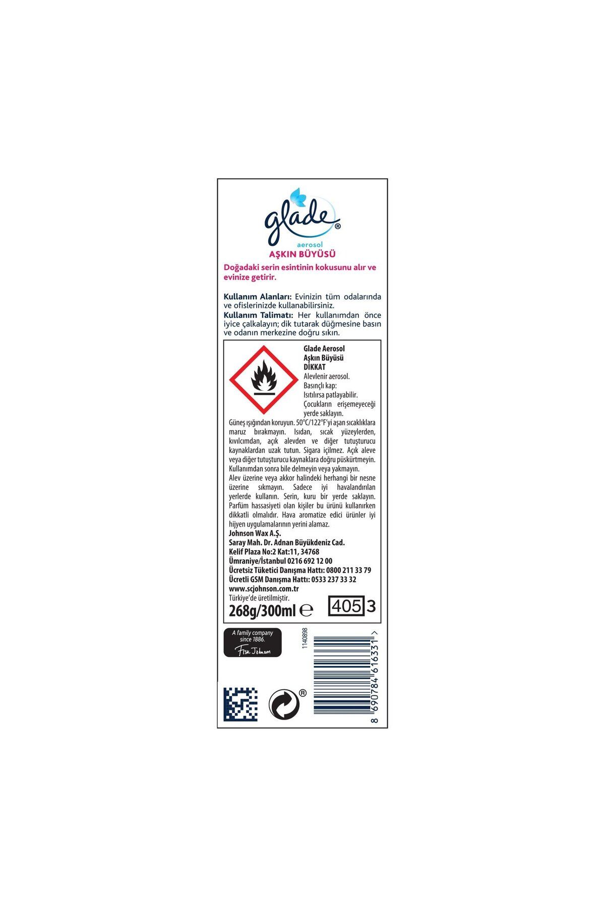 Zamana meydan okuyan aşk duyguları uyandırmak için özenle seçilmiş meyve notaları beyaz çiçeklerden oluşan bir buketle dans ederken romantizmin büyüsünü hissedin. Glade Parfüm Uzmanları tarafından hazırlanan formülü ile odanızın havasını anında değiştirin. Kötü kokulara karşı geliştirilmiş formülü sayesinde evinizin havasını değiştirir. Günlük olarak veya rutin ev temizliğinin ardından evinizin havasını ferahlatmak için kullanın. Glade Aerosol Aşkın Büyüsü ile her gününüz çiçek açsın. Evinizin havasına canlılık katarak, her güne taze çiçek kokularıyla başlamanızı sağlar. Özel olarak hazırlanan parfümü sayesinde her püskürtme odanızı anında ferahlatır. Kötü kokulara karşı geliştirilmiş formülü sayesinde evinizin havasını değiştirir. Özenle seçilmiş meyve notaları ve beyaz çiçeklerin muhteşem uyumu aşkın büyüsünü hissetmeniz için Glade Parfüm Ustaları tarafından titizlikle hazırlanmıştır. Glade Aerosol’ü günlük olarak veya rutin ev temizliğinin ardından evinizin havasını ferahlatmak için kullanın. NASIL KULLANILIR? Her kullanımdan önce iyice çalkalayın; dik tutarak düğmesine basın ve odanın merkezine doğru sıkın. Evinizin tüm odalarında ve ofisinizde kullanabilirsiniz.