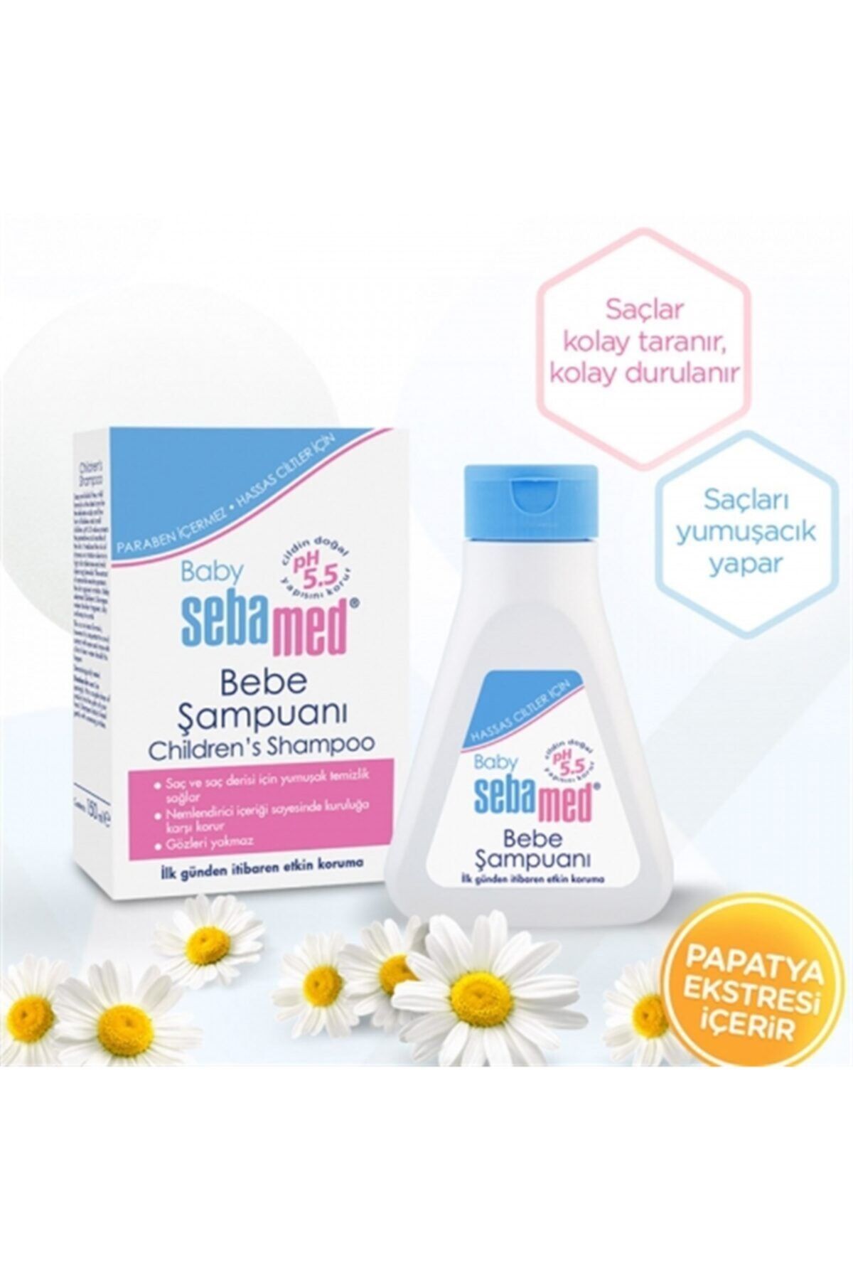 Sebamed Bebe Şampuanı 150 ml Ürün Markası: Sebamed Ürün Boyutu: 150 ml Özet Bilgi: Yumuşak temizleme formülü sayesinde bebeğinizin hassas saçlarına zarar vermeden, saçın güzel kokmasını ve ipeksi bir görüntü almasını sağlar. ; Ürün Faydaları: Yumuşak temizleme formülü sayesinde, saçın güzel kokmasını ve ipeksi bir görüntü almasını sağlar. ; Sabun ve alkali madde içermeyen yumuşak formülü ile bebek ve çocukların hassas saç dipleri ve saç bakımı için idealdir. ; pH 5.5 değeri ile cildi korumaya yardımcı olur. ; Yüksek cilt toleransı ve yumuşak temizleme formülü sayesinde kuruluğun olmamasına yardımcı olur. ; Papatya ekstresi içeriğine de sahiptir. ; Saçın kolayca taranmasını sağlar. ; Saça hoş koku ve ipeksi yumuşaklık verir. ; Kullanım Şekli: Avuç içinize bir miktar şampuan alın. ; Bebeğinizin kafasına dikkatlice sürün. ; Sonra iyice durulayın. ; Ürün Bileşimi: Aqua, Cocamidopropyl Betaine, Sodyum Metil Cocoyl Taurate, Disodium Cocoamphodiacetate, Chamomilla recutita çiçek özü, Coco-Glu-coside, Sodyum Laktat, Sodyum Asetat, Sodyum Askorbat, Gliseril Oleat, Sodyum Laureth Sülfat, PEG-3 Distearat, PEG-150 Laureth-2, Alkol, Parfüm, Laktik Asit, Sitrik Asit, Sodyum Hidroksit, Askorbil Palmit-ate, Benzil Alkol, Fenoksietanol, Sodyum Benzoat.;