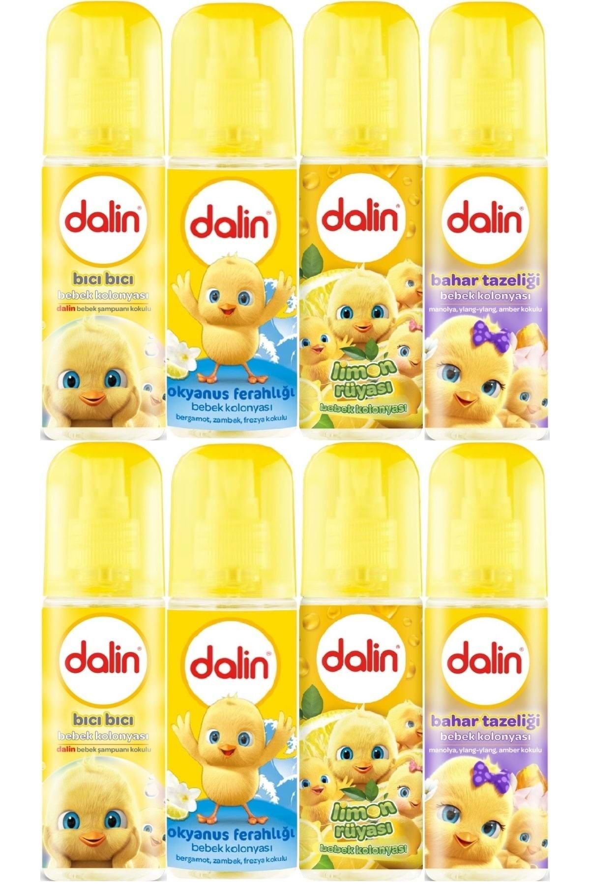 Dalin Bebek Kolonyası 150ML (Bıcı Bıcı-Okyanus-Limon-Bahar) (Karma 8 Li Set) Dalin Bebek Kolonyası 150ML Klasik (Bıcı Bıcı Kokusu) 2 ADET Dalin Bebek Kolonyası 150ML Okyanus Ferahlığı (Bergamot-Zambak-Frezya Kokulu) 2 ADET Dalin Bebek Kolonyası 150ML Limon Çiçeği (Limon-Bergomat-Papatya) 2 ADET Dalin Bebek Kolonyası 150ML Bahar Tazeliği (Manolya-Ylang,Ylang-Amber Kokulu) 2 ADET Bebekliğin kokusu bu şişede! Bebekliğin kokusu Dalin ile kalıcı tazelik ve ferahlık sağlar. Kalıcı tazelik ve ferahlık verir, böylece mis kokulu Dalin ile temizliğin keyfini tüm gün çıkarabilirsiniz. Özel formülü hem sizin hem bebeğiniz için idealdir. Dalin Bebek Kolonyaları ile ferahlığın keyfini her an yanınızda taşıyabilirsiniz. Ürün Kullanımı İhtiyacınız olan miktarı avucunuza püskürterek hem bebeğinizin cildine hem de kendi cildinize nazikçe uygulayın. Yenidoğandan itibaren bebeğinizin hassas cildi için güvenlidir. Tüm aile bireyleri tarafından kullanılabilir.