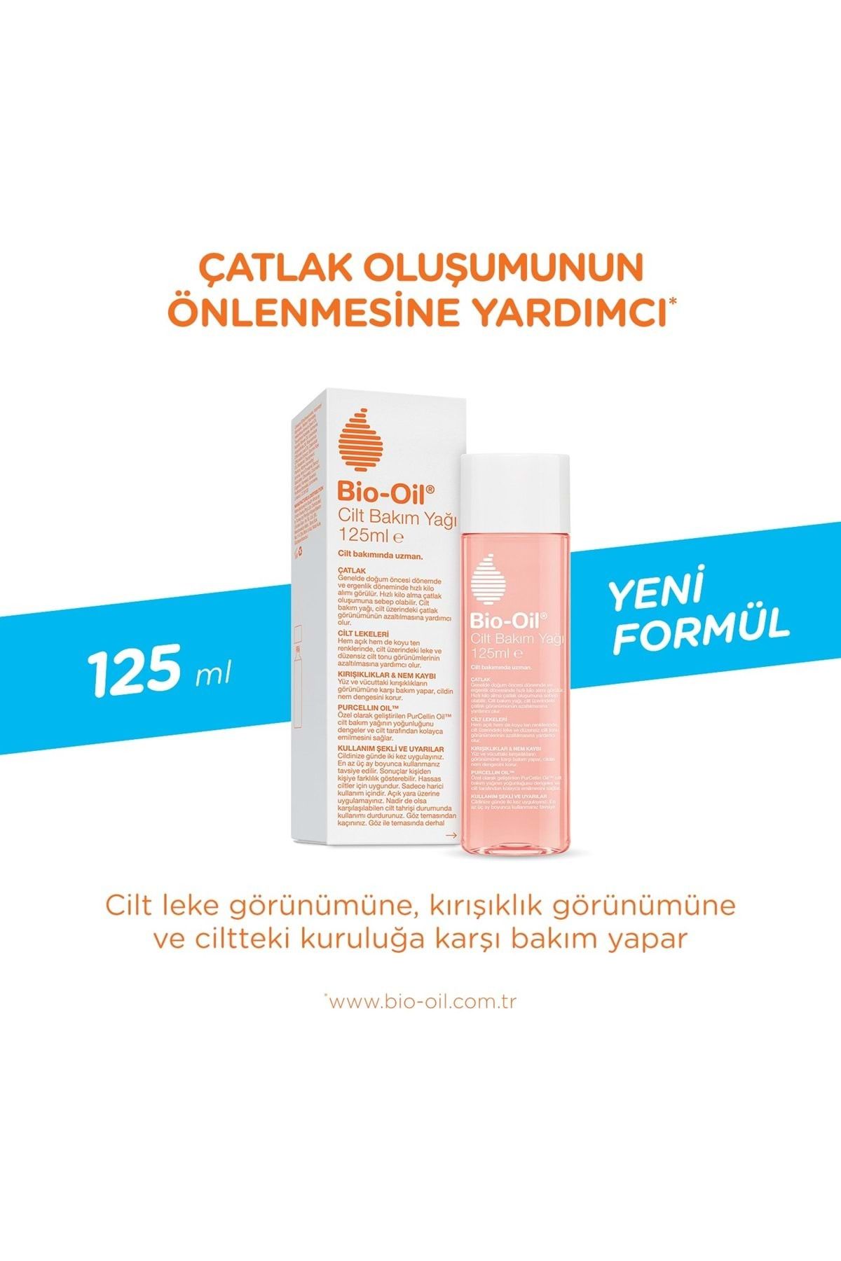 Bio; Oil Çatlak Oluşumunu Önleyici Cilt Bakım Yağı Karma 2 Li Set 125ML+60ML (Yeni Formül); Bio; Oil Çatlak Oluşumunu Önleyici Cilt Bakım Yağı 60ML (Yeni Formül) : 1 Adet; Bio; Oil Çatlak Oluşumunu Önleyici Cilt Bakım Yağı 125ML (Yeni Formül) : 1 Adet Bio; oil Çatlak Karşıtı & Nemlendirici Cilt Bakım Yağı, A ve E vitaminleri ile Papatya, Biberiye, Lavanta ve Calendula yağları içerir; Çatlak bakımının yanı sıra; cilt lekelerine, yaşlanmaya ve ciltteki kuruluğa karşı bakım yapar; Cildin nem dengesini korur; İçeriğindeki PurCellin Oil™ sayesinde cilt tarafından kolayca emilir, yağlı bir his bırakmaz; Hassas ciltler için uygundur; Bio; Oil, formülünde bitki özleri ve vitaminleri bir araya getiren bir cilt bakım yağıdır; İçeriğinde çok özel bir etken madde olan PurCellin Yağı™ bulunmaktadır; Bu yağ, içeriğindeki bitki özlerinin ve vitaminlerin faydalarının cilt tarafından kolayca emilmesini sağlar; Hafif yapısı sayesinde yağlı bir his bırakmaz; Çatlak: Bio; Oil, cilt üzerindeki çatlak görünümünde gözle görülür azalma sağlar; Cilt Lekeleri: Bio; Oil, hem açık hem de koyu ten renklerinde, cilt üzerindeki leke ve düzensiz cilt tonu görünümlerinin iyileşmesine yardımcı olur; Yaşlanma: Bio; Oil, yüz ve vücuttaki kırışıklıklara karşı bakım yapar; Nem Kaybı: Bio; Oil, cildin nem dengesini korur;