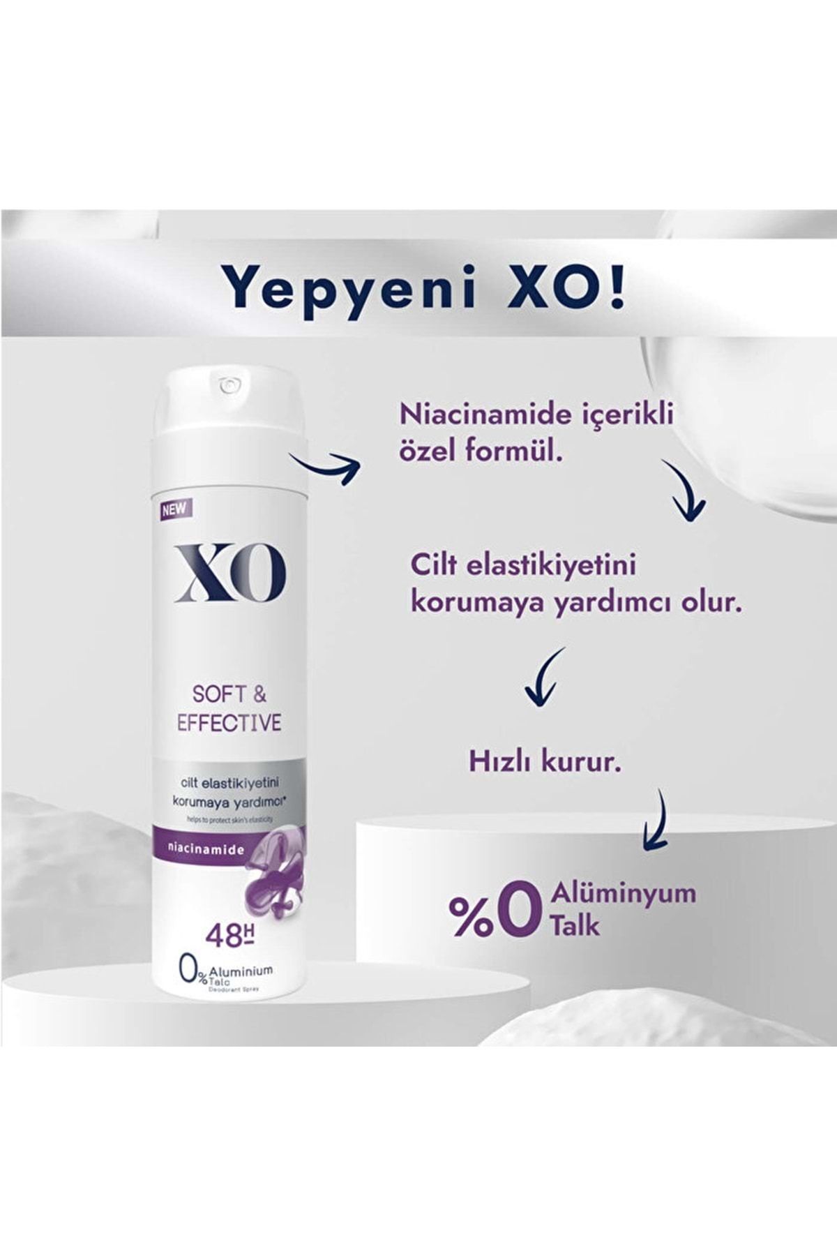 XO Deodorant 150ML Women-Kadın Soft & Effective (3 Lü Set) – Niacinamide içerikli özel formülü ile cildin elastikiyetini korumasına yardımcı olur, cilde nefes aldırır. . – Alüminyum ve pudra içermeyen özelliği ile kötü kokuyu maskeler, gözeneklerin tıkanmasını önler. – 48 saat etkin koruma sağlar. – Geri dönüştürülebilir ambalajı ile doğa dostudur. – Vegan formüle sahiptir.