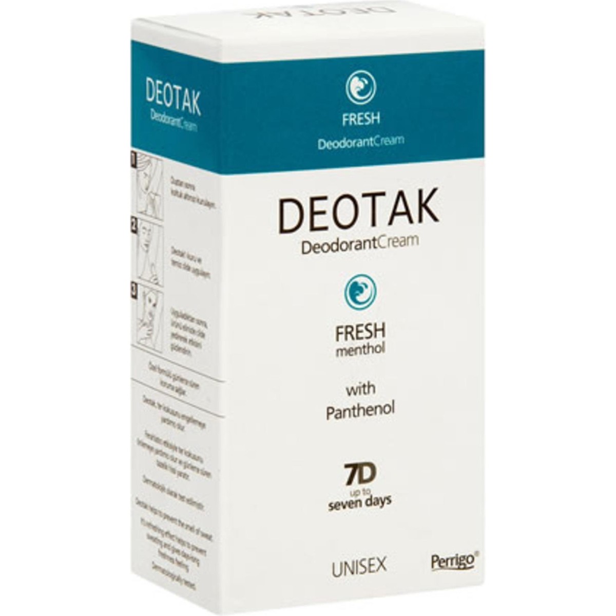 Deotak Deodorant Krem Fresh, ferahlatıcı etkisiyle ter sunu olur ve uzun süreli tazelik hissi yaratır. Dermatolojik olarak test edilmiştir. Kullanımı: Duştan sonra koltuk altınızı kurulayın ve Deotak’ı kuru ve temiz cilde uygulayın. Uyguladıktan sonra, ürünü elinizle cilde yedirerek etkisini güçlendirin.