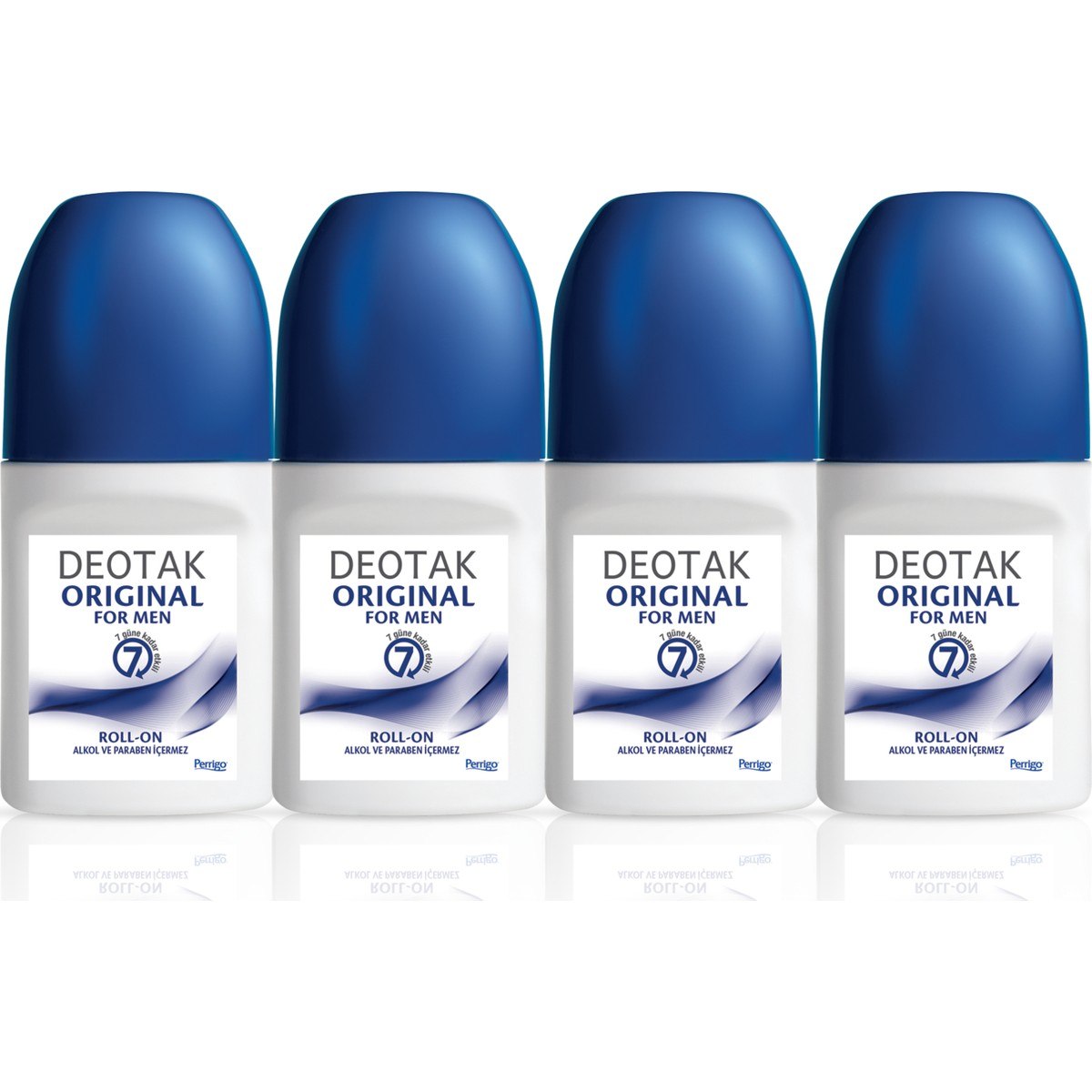 Deotak Original Roll-on Deodorant Erkek 4 Adet:nDeotak Original Roll Alkol ve Paraben içermez.nDermatolojik olarak test edilmiştir. Giyisilerde Beyaz iz Bırakmaz Sadece harici kullanım içindir.nÇocukların ulaşamayacağı yerlerde ve 15-25 derece yerlerde saklayın.nTemiz ve Kuru Cilde uygulayın.