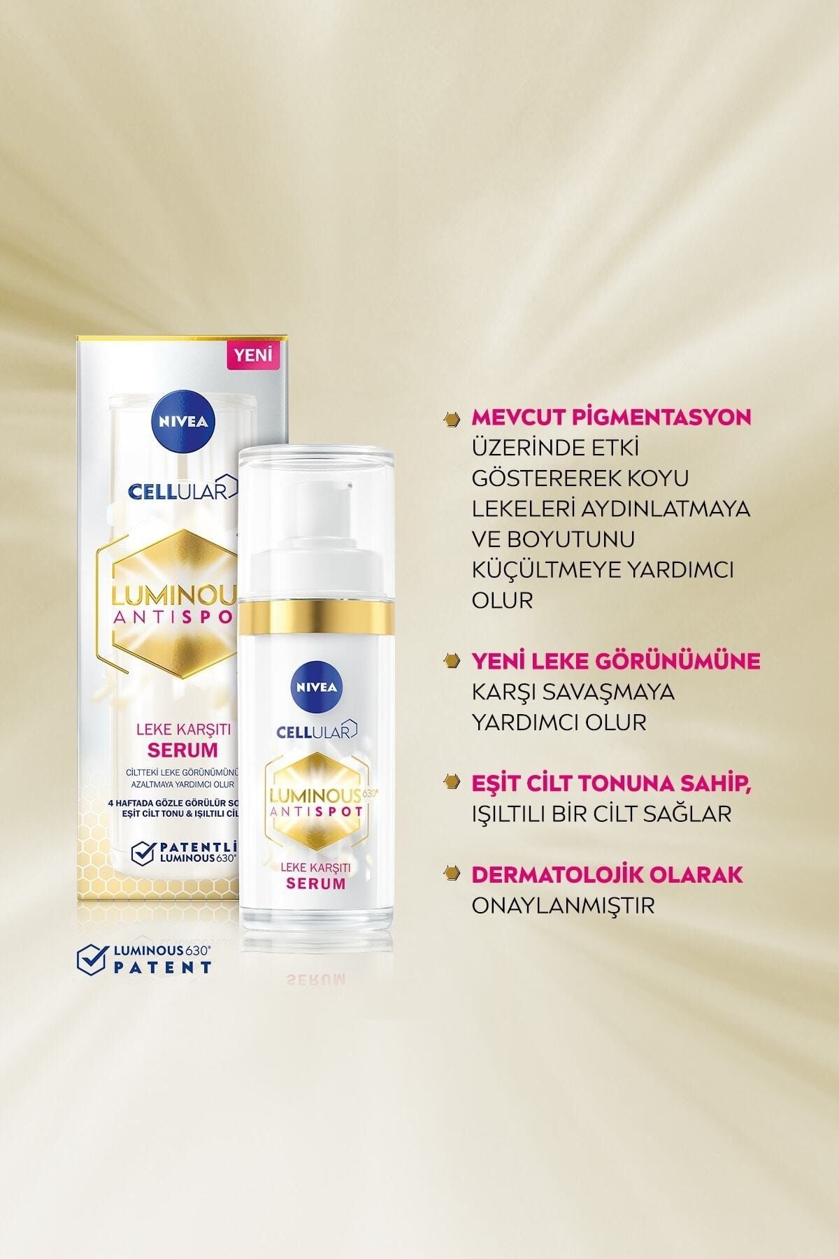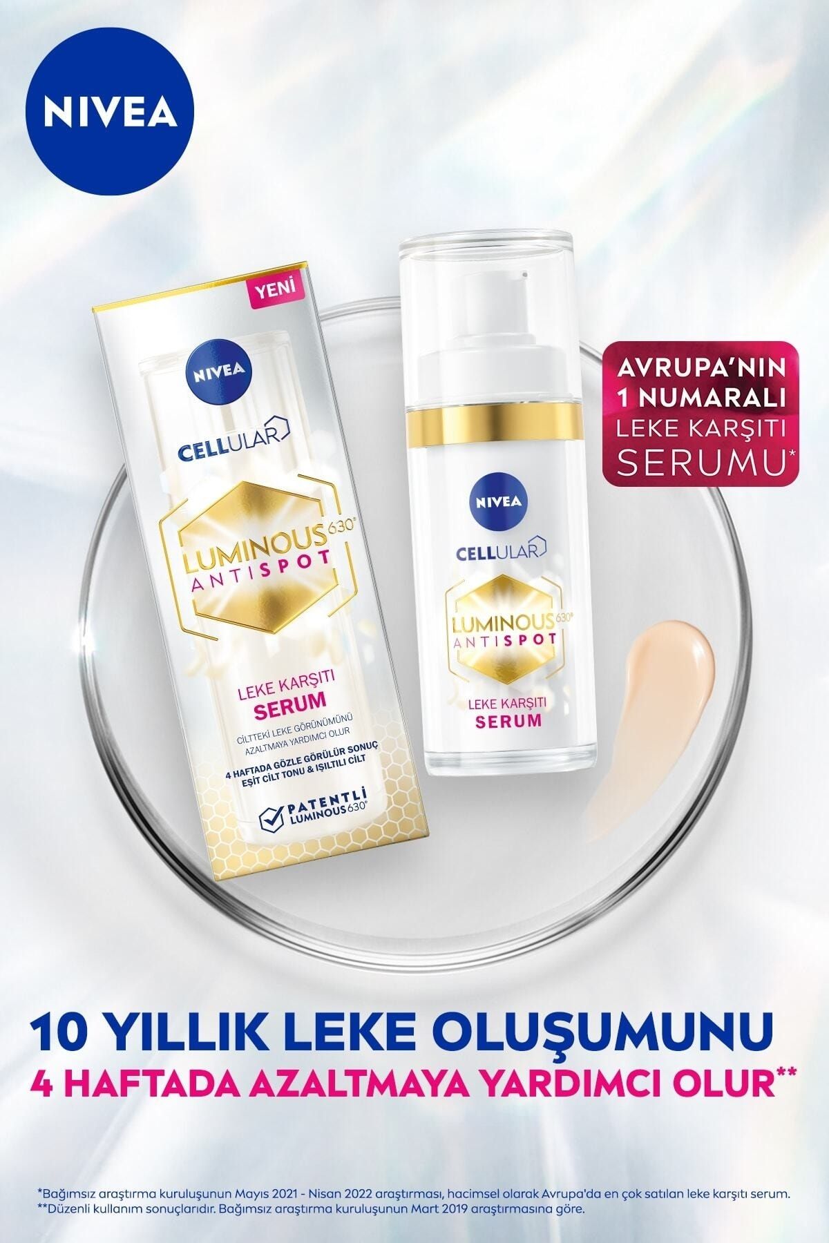 10 yıllık leke oluşumunu 4 haftada azaltmaya yardımcı olur. Yeni leke görünümüne karşı savaşmaya yardımcı olur. Patentli LUMINOUS630® Eşit cilt tonuna sahip, ışıltılı bir cilt sağlar. Aqua, Isopropyl Palmitate, Cetearyl Isononanoate, Dimethicone, Glycerin, Alcohol Denat., Cocoglycerides, Distarch Phosphate, Butylene Glycol, Methylpropanediol, Tapioca Starch, Isobutylamido Thiazolyl Resorcinol, Sodium Hyaluronate, Tocopheryl Acetate, Stearyl Alcohol, Cetyl Alcohol, Glyceryl Stearate, Sodium Ascorbyl Phosphate, Sodium Stearoyl Glutamate, Sodium Polyacrylate, Acrylates/C10-30 Alkyl Acrylate Crosspolymer, Trisodium EDTA, Sodium Chloride, Sodium Hydroxide, Sodium Sulfate, Phenoxyethanol, Benzyl Alcohol, Parfum, CI 15985, CI 47005