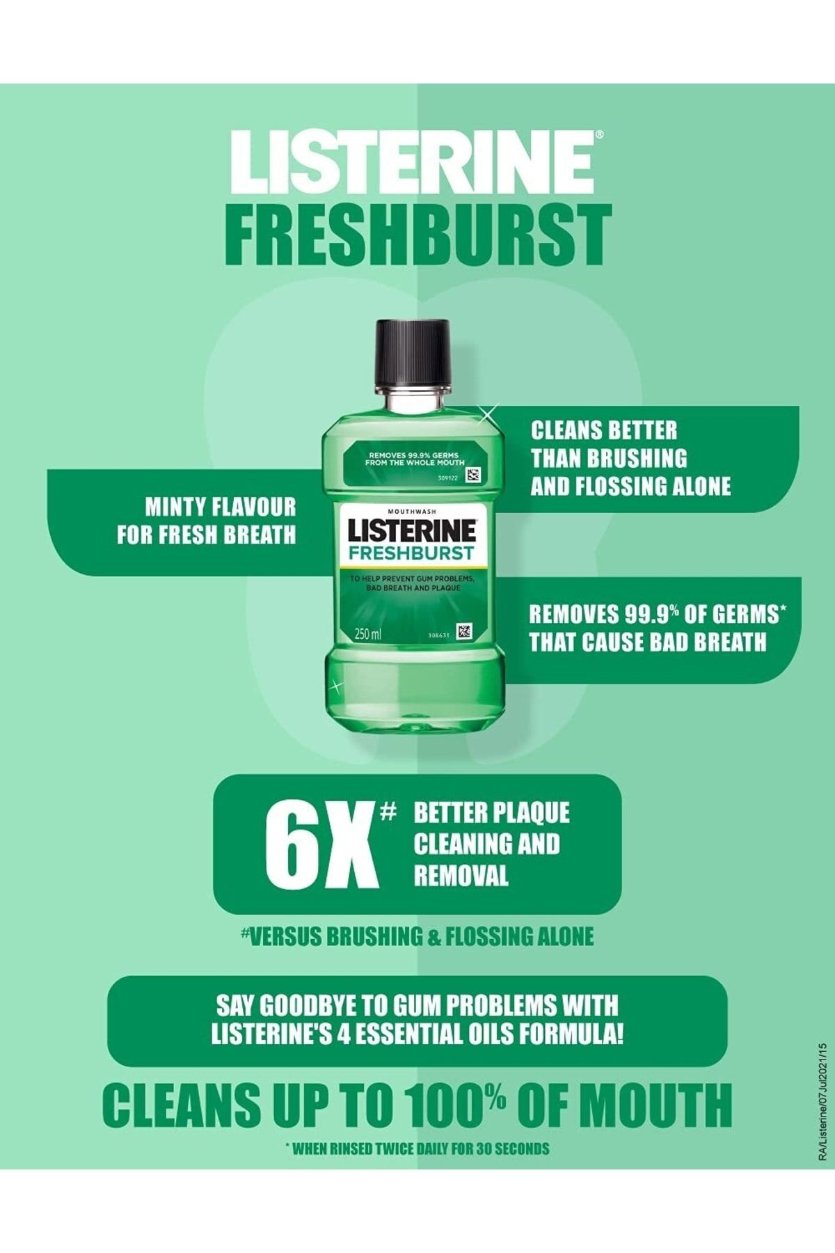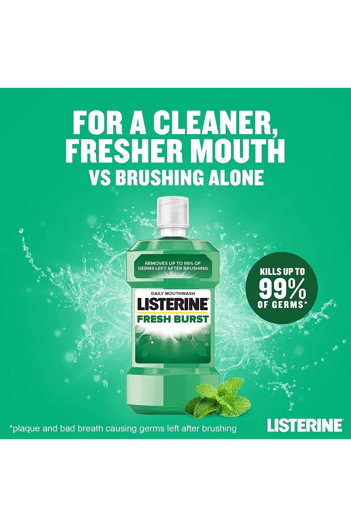 Fresh Burst Ağız Bakım Suyu 500 Ml günde iki kez kullanildiğinda, listerine fresh burst ağiz bakim suyu plağa karşi 24 saat süreyle etkin koruma sağlar ve nefesinizde kalici ferahlik güveni sunar. etkinliği klinik olarak kanitlanmiştir: •ağzinizda hijyen sağlayarak diş eti hastaliklarinin en önemli nedeni olan plak oluşumunu azaltir ve önler • firçalama ile ulaşilamayan alanlara ulaşir. • nefesinizi tazeler