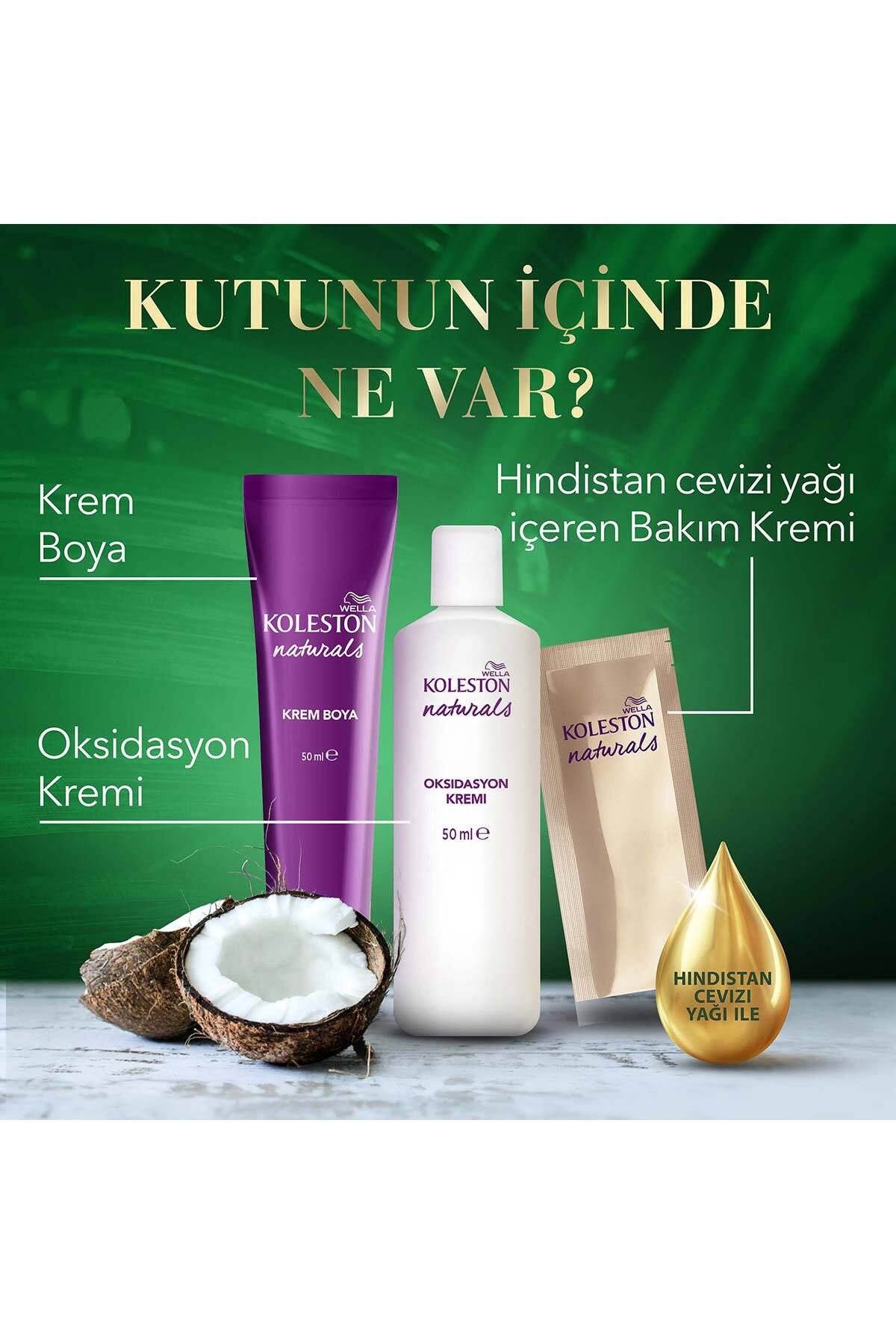 Wella Koleston Naturals’ı keşfedin ve 6 haftaya kadar muhteşem, yoğun bir rengin ve sağlıklı görünümün tadını çıkarın; En inatçı beyazları bile dipten uca kadar kusursuz şekilde kapatır; Wella Koleston Naturals, Wella Labaratuarlarında geliştirilen özel sistemi sayesinde, yoğun renk pigmentleri ile hindistan cevizi yağı içeren besleyici serumu bir araya getirerek formüle edilmiştir; Bu paketin icindekiler: 1 adet Krem Boya, 50 ml 1 adet Oksidasyon Kremi, 50 ml 1 adet Hindistan Cevizi Yağı İçeren Bakım Kremi, 10 ml 1 Kullanım kılavuzu 1 Çift Eldiven;