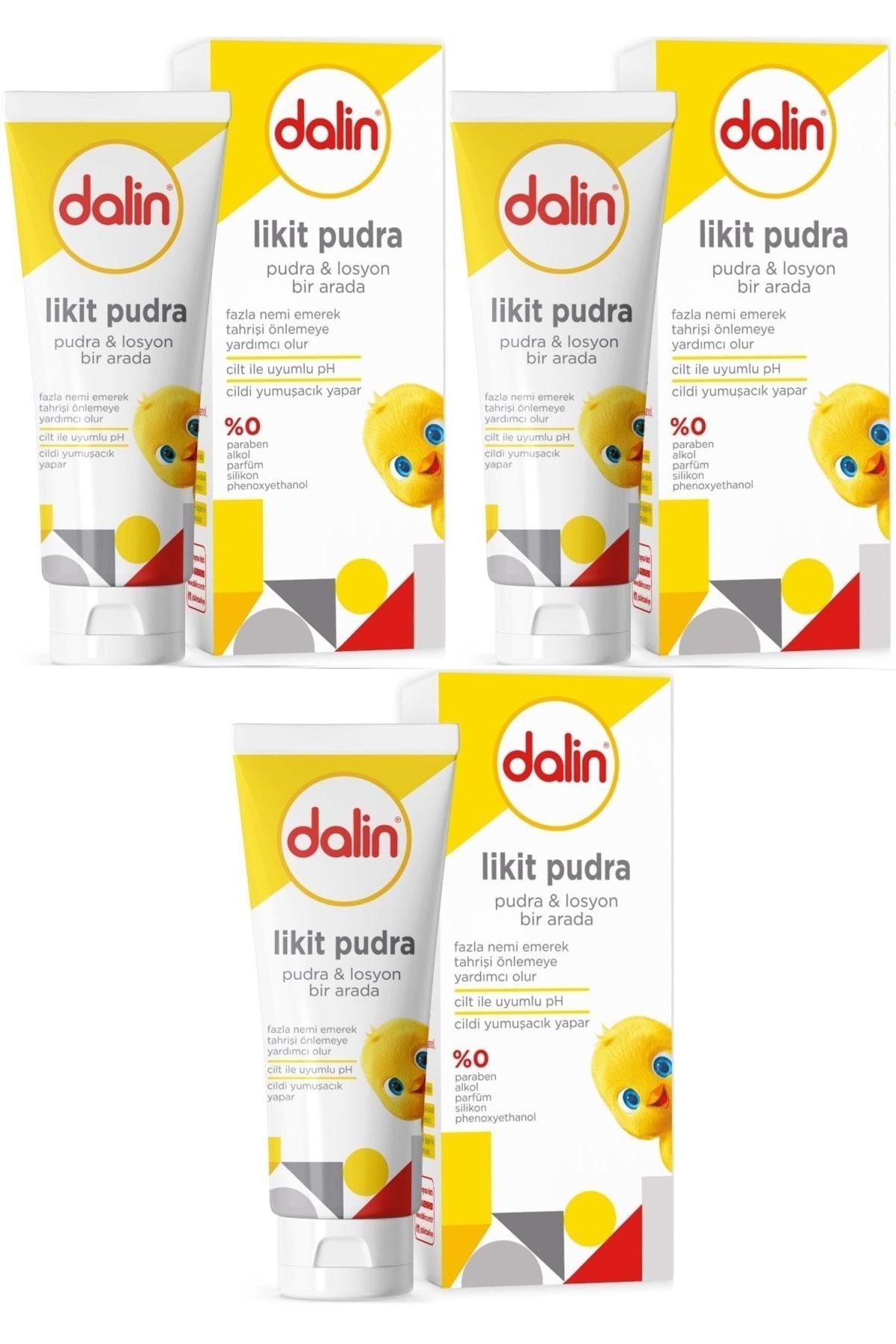 Dalin Likid Pudra 100GR (Pudra ve Losyon bir arada) (3 Lü Set) miniklere pudra ve losyonu buluşturan yenilik: likit pudra! Dalin likit pudra, losyon kıvamındaki özel yapısı ile bebeğinizin hassas cildine özel olarak geliştirilmiştir. Kolayca emilir ve cildi yumuşacık yapar. Terleme ve idrarla oluşan fazla nemi emerek, oluşabilecek kızarıklık ve tahrişin önlenmesine yardımcı olur. Boğum ve koltuk altı bölgelerindeki tahriş ve kızarıklığı önlemede etkilidir. Her bez değişiminde kullanıma uygundur. Talk içermez. Hipoalerjeniktir Cildin pH değeri ile uyumludur. %0 alkol. Dermatolojik olarak test edilmiştir. Ürün Kullanımı Avucunuza yeterli miktarda dökün ve bebeğinizin cildine nazikçe yedirin. Hızlıca emilir, kalıntı bırakmaz. Yenidoğandan itibaren bebeğinizin hassas cildi için güvenlidir. Tüm aile bireyleri tarafından kullanılabilir.