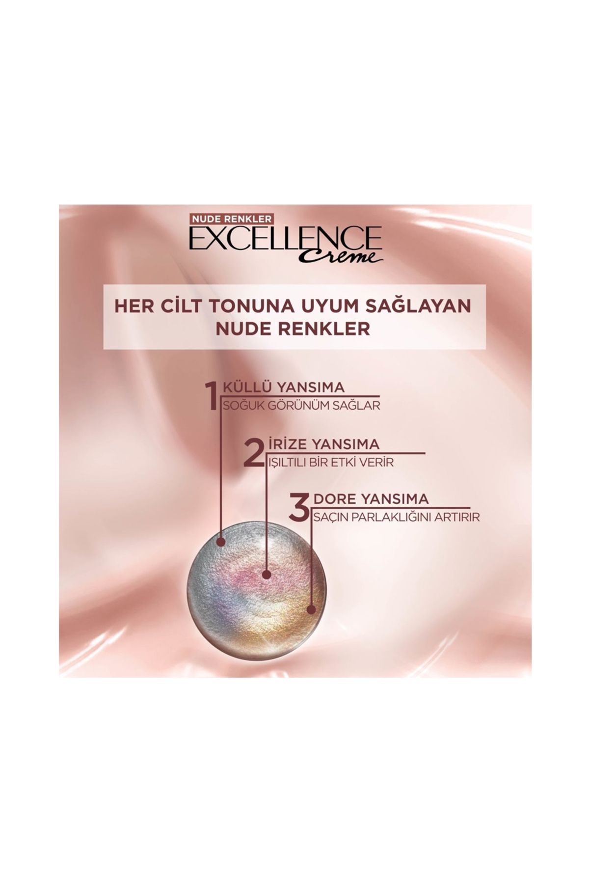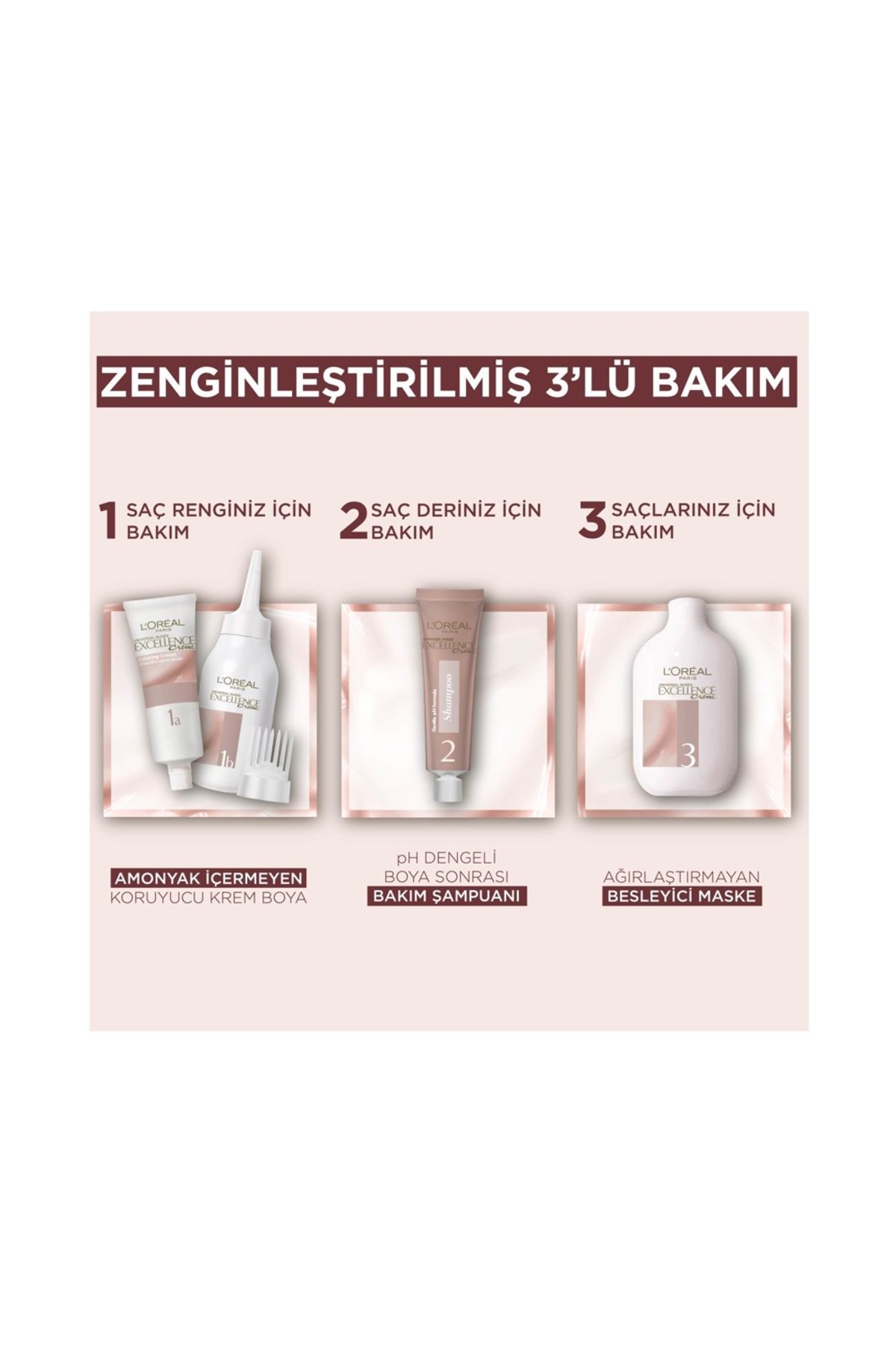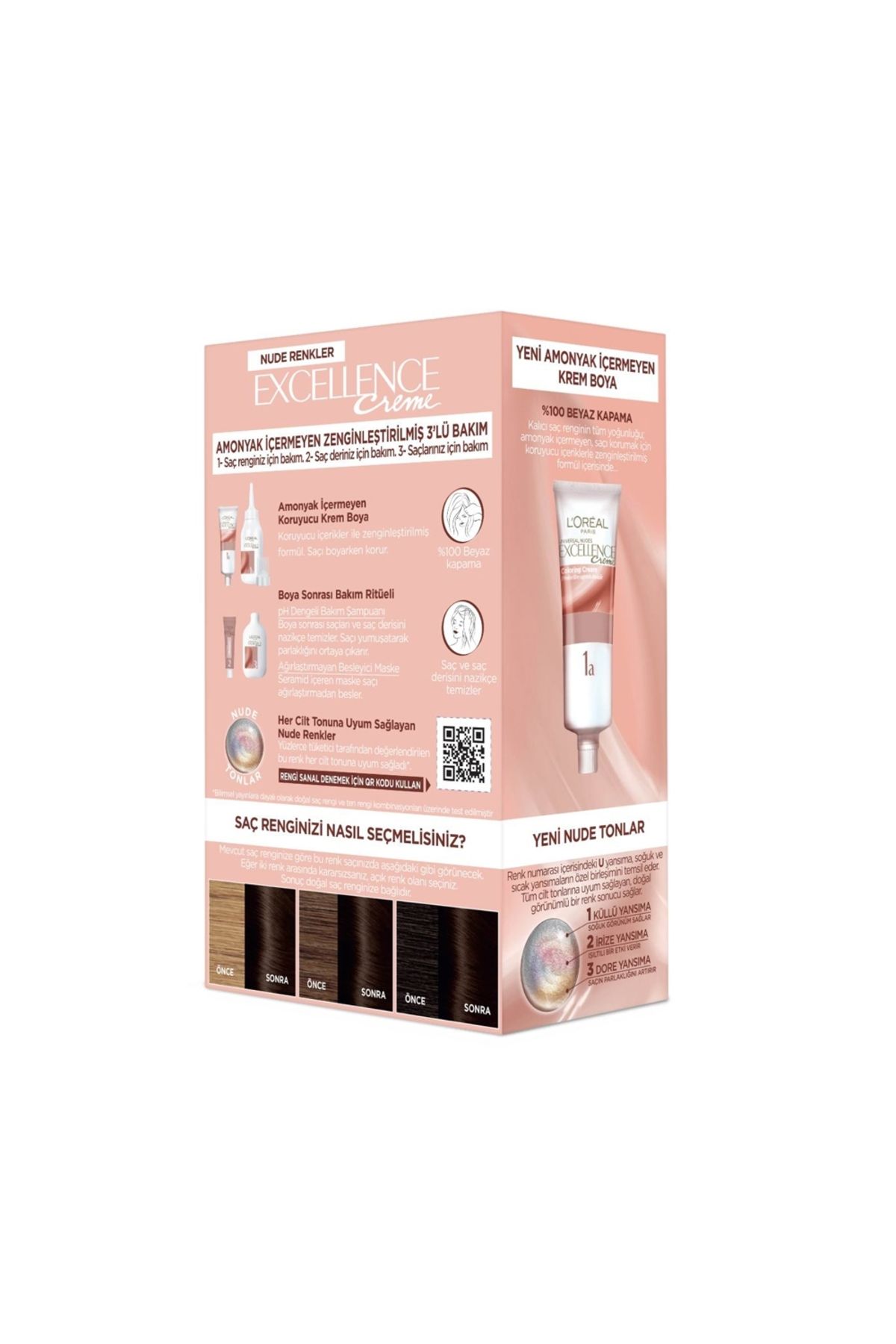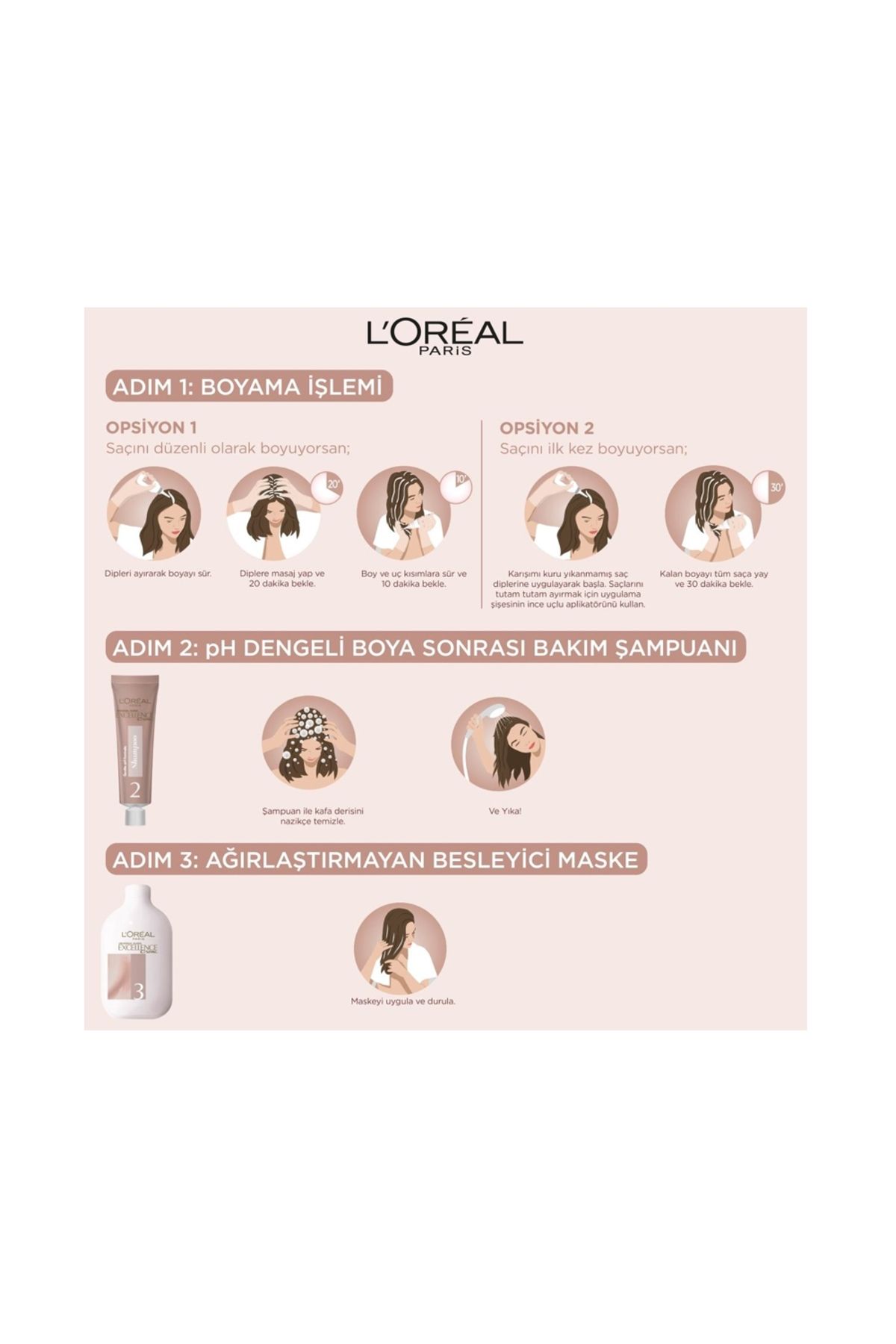 L’Oréal Paris’in geliştirmiş olduğu soğuk ve sıcak yansımaların özel birleşimini temsil eden içerisindeki ‘’U Yansıma’’ ile doğal görünümlü, her cilt tonuna uyan saç renklerine kavuşmak artık kadınlar için çok kolay! Üstelik zenginleştirilmiş 3’lü Bakım artık Amonyaksız! Zenginleştirilmiş 3’lü bakım: Amonyak içermeyen Koruyucu Krem Boya, pH dengeli Bakım Şampuanı ve Ağırlaştırmayan Besleyici Bakım Maskesi ile uzun süre kalıcı renkler! Kullanımı: Krem Saç Boyasını Oksidan Krem şişesinin içine dökün ve kapağı kapadıktan sonra iyice çalkalayın. ; Saçınızı düzenli olarak boyuyorsanız ürünü saç diplerinize masaj yaparak uygulayın ve 20 dakika bekleyin, Sonrasında kalan boyayı saç boy ve uçlarına uygulayıp 10 dakika daha bekleyin. ; Saçlarınızı ilk kez boyuyorsanız ürünü saçınızın tümüne masaj yaparak yayın ve 30 dakika bekleyin.Saçlarınızı pH Dengeli Boya Sonrası Bakım Şampuanı ve su ile duruladıktan sonra Besleyici Maskeyi uygulayın.;
