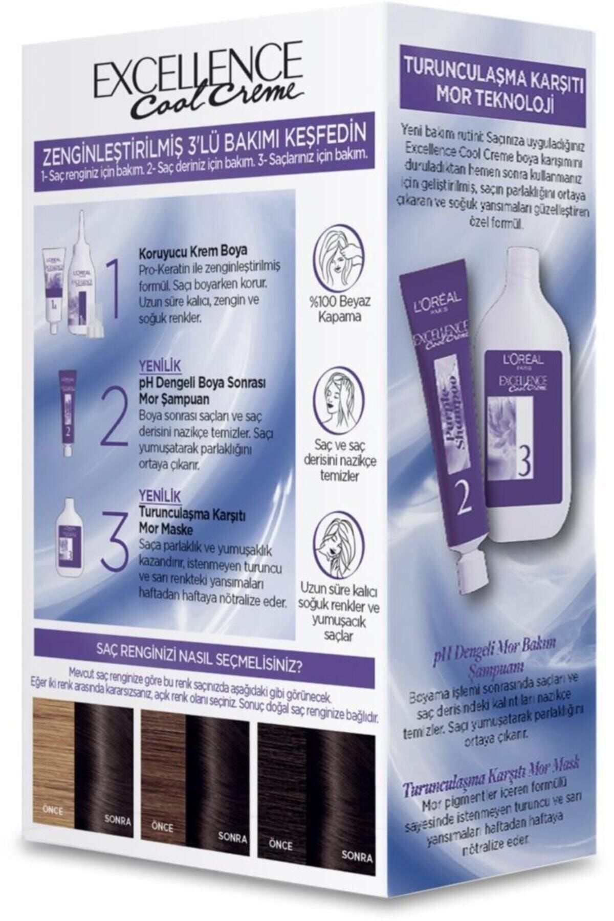 Excellence Cool Creme’in Zenginleştirilmiş 3’lü Bakım:Pro-keratin içeren koruyucu krem boya, turunculaşma karşıtı mor teknolojiyesahip pH dengeli Mor Şampuanı ve Mor Maskesi sayesinde uzun süre kalıcı soğukrenkler ve %100 beyaz kapama! H dengeli boya sonrası Mor Şampuan ile saçlarınızı ve saçderinizi nazikçe temizlerken eşsiz bir bakım uygular. Saçı yumuşatarakparlaklığını ortaya çıkarır. Turunculaşma Karşıtı Mor Maske ile saça parlaklıkve yumuşaklık kazandırır, istenmeyen turuncu ve sarı renkteki yansımalarıhaftadan haftaya nötralize eder.
