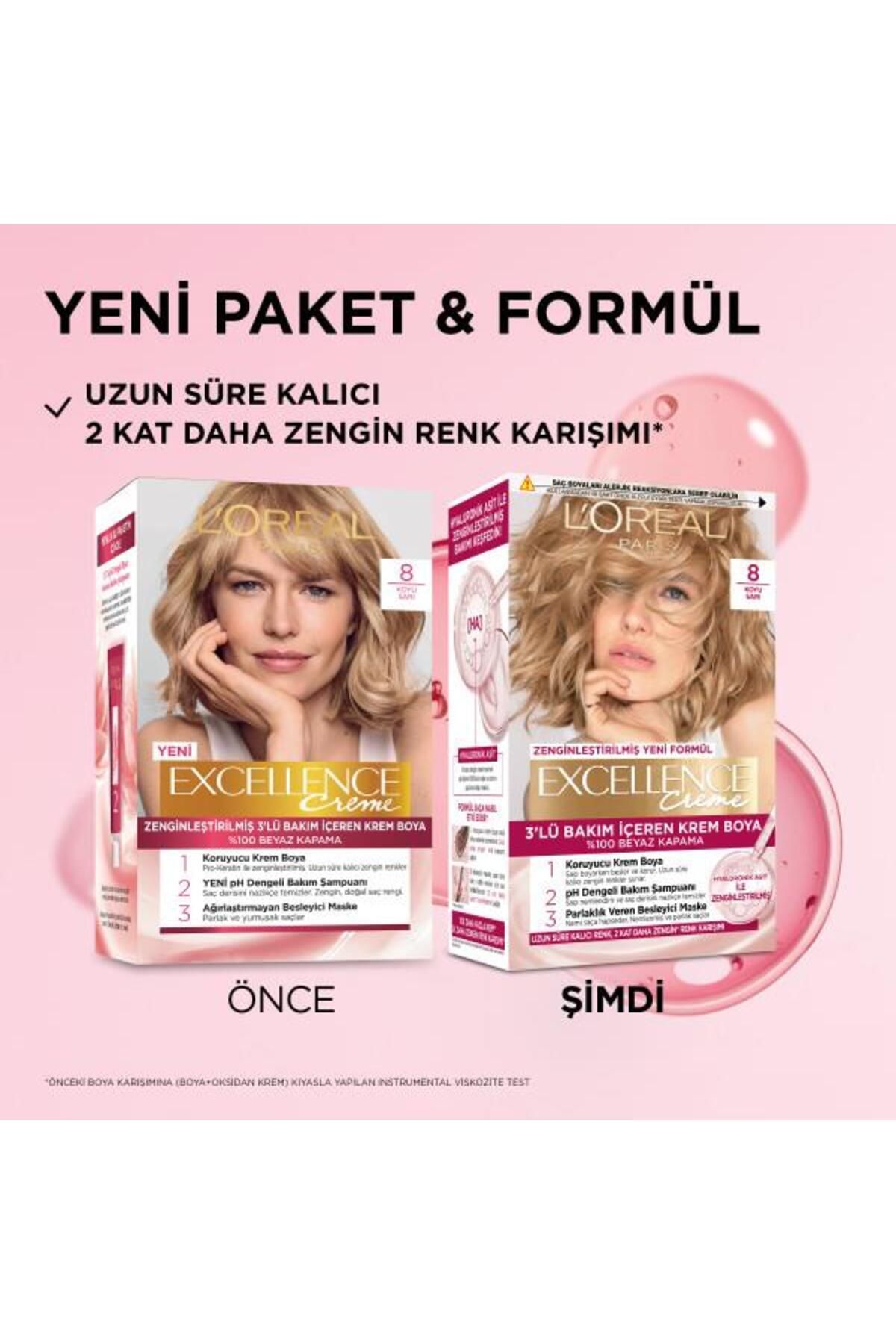 Excellence Creme ile boyama öncesine göre gözle görülür daha bakımlı saçlar! Excellence Creme beyazları %100 kapatırken daha sağlıklı görünen saçlar için saça nemi hapseder. Hyaluronik Asitle zenginleştirilen formülüyle 2 kat daha zengin renk karışımı* ve 10 kat daha fazla** nemlendirme sunar. 3’lü Bakım Rutini; Koruyucu Krem Boya ile saçı boyarken besler ve korur. Uzun süre kalıcı, zengin renk sonucu ortaya çıkartır. pH Dengeli Boya Sonrası Bakım Şampuanı Hyaluronik Asit içeren formülü ile saçı nemlendirir. Saçın doğal ve güzel rengini ortaya çıkarır. Parlaklık Veren Besleyici Maske Hyaluronik Asit içeren formülü ile saç kütiküllerine nemi hapsederek saçları besler ve uzun süre kalıcı ışıltılı renk sonucu sağlar.