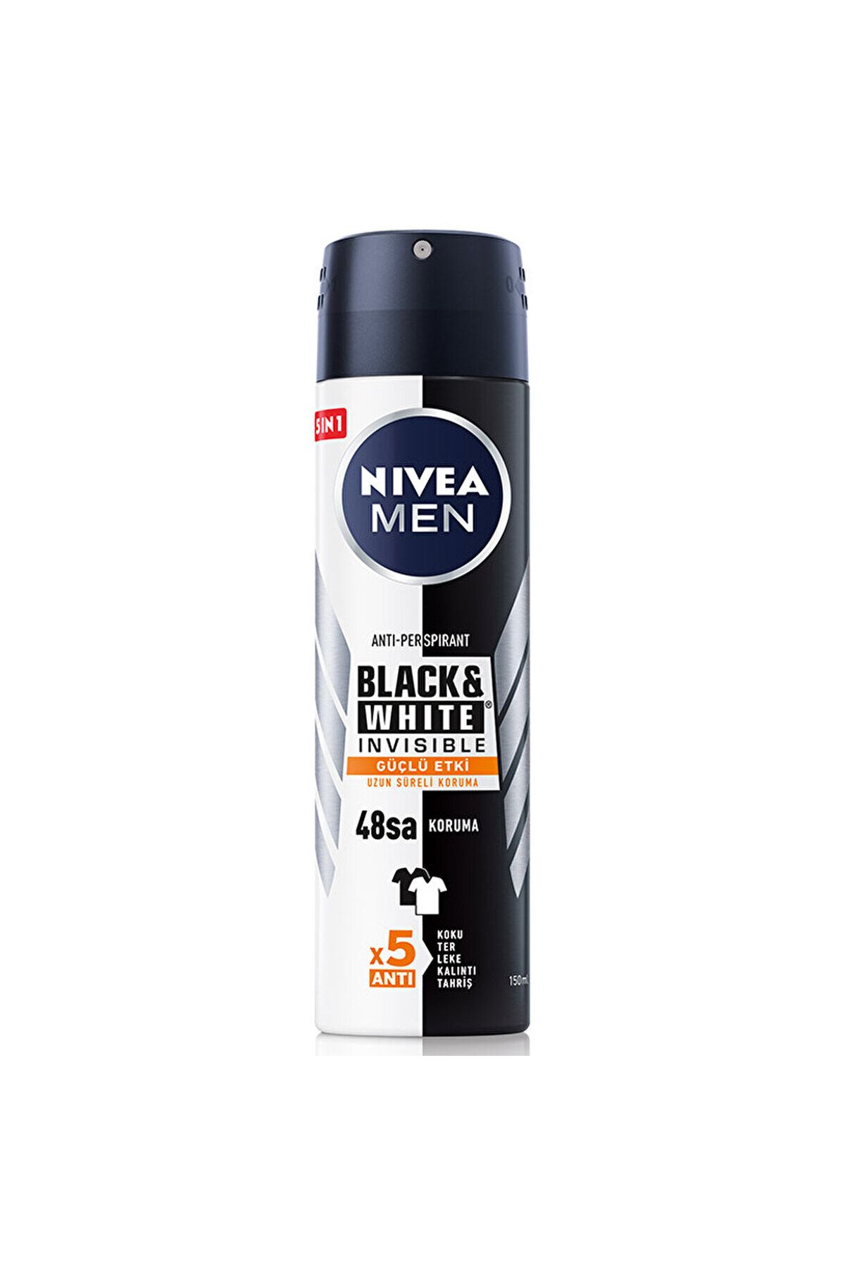 Türkiye’nin Lider Deodorantı NIVEA’dan NIVEA Men Erkek Sprey Deodorant Black&White Invisible Güçlü Etki 48 Saat Anti-perspirant Koruma 150 ml • NIVEA Men Erkek Sprey Deodorant Black&White Invisible Güçlü Etki özel formülü sayesinde uzun süreli koruma sağlar. • Cildinizde gün boyu süren hoş ve ferah bir his bırakır. • Koyu renkli giysilerde beyaz iz, açık renkli giysilerde sarı leke oluşumuna karşıdır. • Özel geliştirilmiş x5 anti formülü sayesinde koku, ter, leke, kalıntı ve tahrişe karşı savaşır. • Cildinize önem veren 48 saate kadar etkili anti-perspirant koruması sağlar. Hangi Cilt Tipleri İçin Uygundur? • Tüm cilt tipleri için uygundur. • Ciltle uyumu dermatolojik olarak kanıtlanmıştır. Kullanım Kutuyu dik tutarak 15 cm mesafeden çıplak ve temiz koltuk altına püskürtün. Ürün koltuk altına uyguladıktan sonra tamamen kurumasını bekleyin.