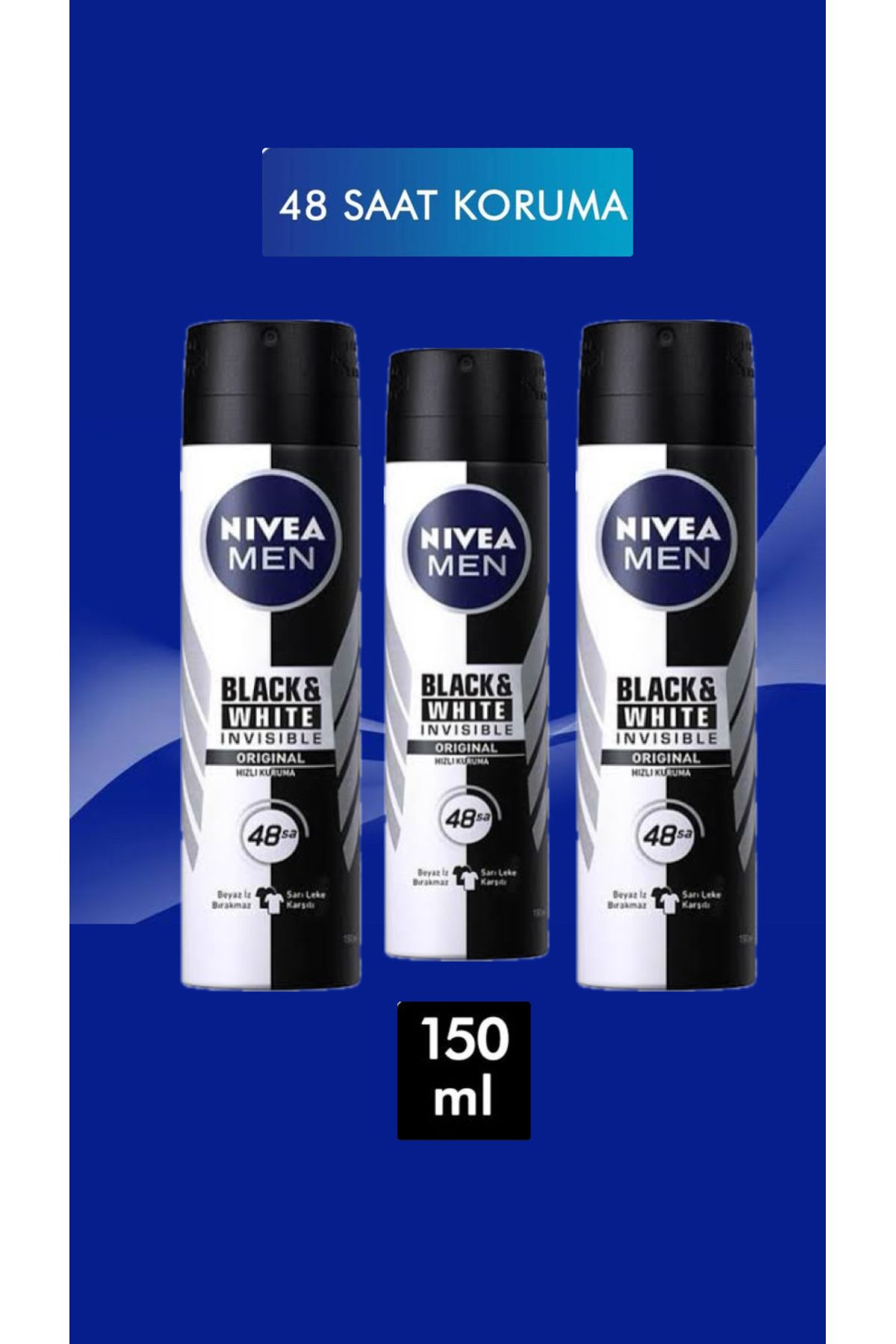 Türkiye’nin Lider Deodorantı NIVEA’dan NIVEA Men Erkek Sprey Deodorant Black&White Invisible Original 48 Saat Anti-perspirant Koruma 150 ml • NIVEA Men Erkek Sprey Deodorant Black&White Invisible Original, koyu renkli giysilerde beyaz, açık renkli giysilerde sarı leke karşıtıdır. ; • Siyahlar siyah, beyazlar daha uzun süre beyaz kalır. ; • Cildinize önem veren 48 saate kadar etkili anti-perspirant koruması sağlar. ; • Pudralı ve alkolsüzdür. ; Boya maddesi içermez.;
