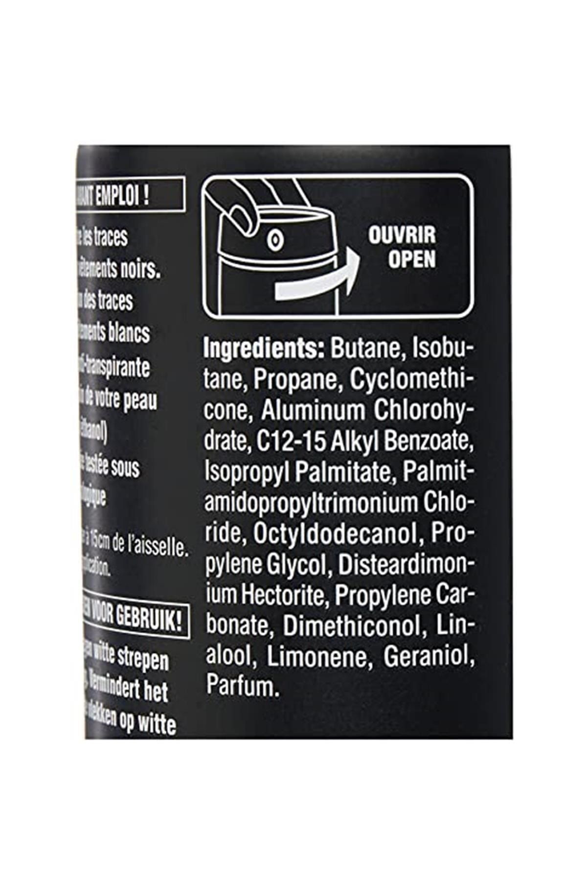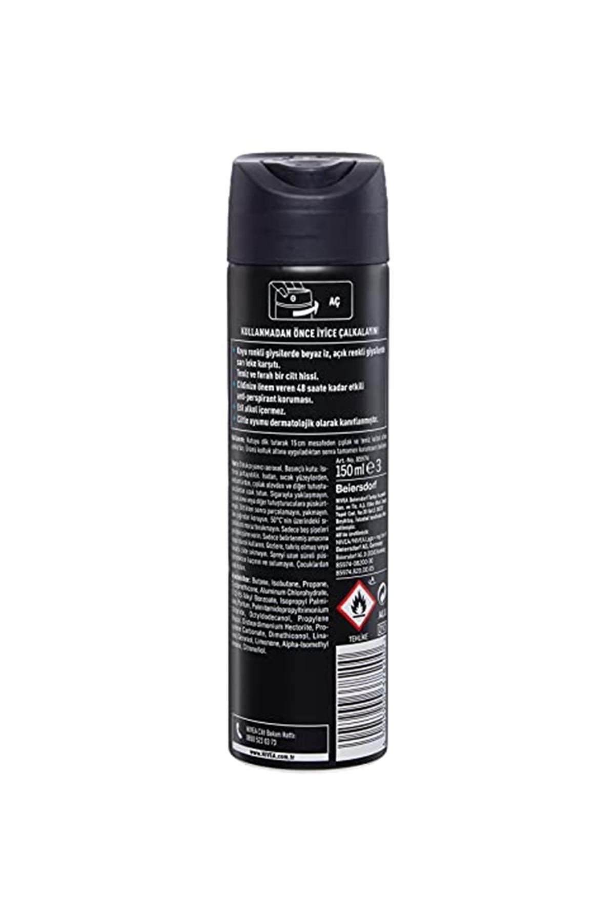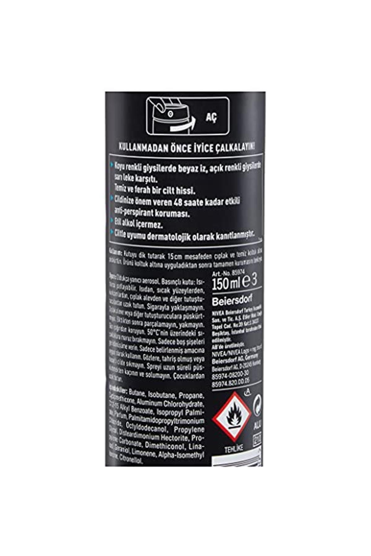 Türkiye’nin Lider Deodorantı NIVEA MEN Black & White Invisible Fresh, koyu renkli giysilerde beyaz, açık renkli giysilerde sarı leke karşıtıdır. ; Siyahlar siyah, beyazlar daha uzun süre beyaz kalır. ; Temiz ve ferah bir cilt hissi verir. ; Cildinize önem veren 48 saate kadar etkili anti -perspirant koruması sağlar. ; Etil alkol içermez. ; Ciltle uyumu dermatolojik olarak onaylanmıştır. ; Nasıl Kullanılır: Kutuyu dik tutarak 15cm mesafeden çıplak ve temiz koltuk altına püskürtün. ; Ürün koltuk altına uyguladıktan sonra tamamen kurumasını bekleyin. ; İçindekiler Butane, Isobutane, Propane, Cyclomethicone, Aluminum Chlorohydrate, Isopropyl Palmitate, C12-15 Alkyl Benzoate, Parfum, Palmitamidopropyltrimonium Chloride, Octyldodecanol, Propylene Carbonate, Dimethiconol, Propylene Glycol, Linalool, Geraniol, Limonene, Alpha-Isomethyl Ionone, Citronellol;