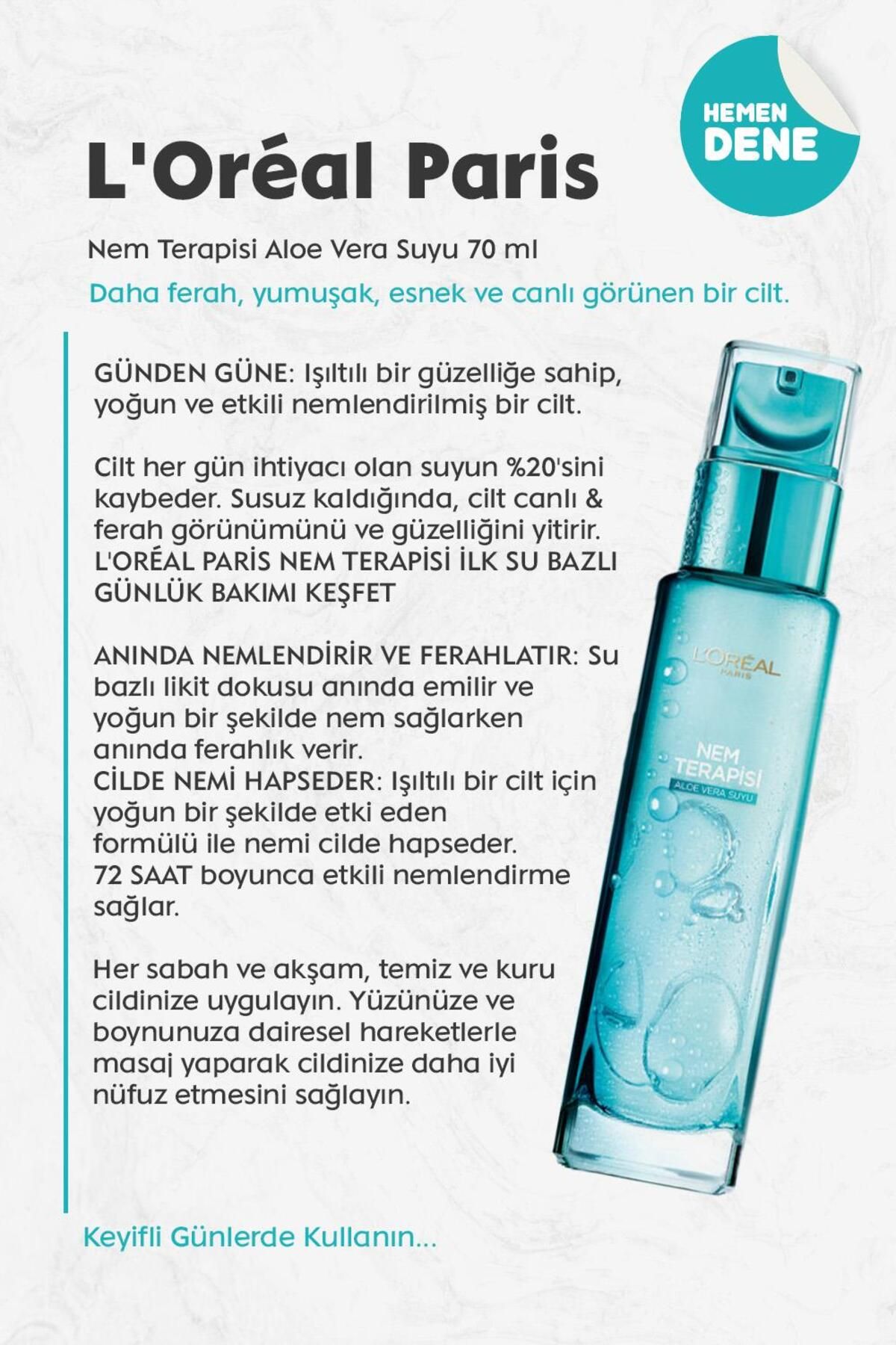 L’Oréal Paris Nem Terapisi Aloe Vera Suyu 70 ml HIZLI VE GÖZLE GÖRÜLEBİLİR SONUÇLARANINDA: Daha ferah, yumuşak, esnek ve canlı görünen bir cilt. ; GÜNDEN GÜNE: Işıltılı bir güzelliğe sahip, yoğun ve etkili nemlendirilmiş bir cilt. ; Cilt her gün ihtiyacı olan suyun %20’sini kaybeder. ; Susuz kaldığında, cilt canlı & ferah görünümünü ve güzelliğini yitirir.L’ORÉAL PARİS NEM TERAPİSİ İLK SU BAZLI GÜNLÜK BAKIMI KEŞFET ANINDA NEMLENDİRİR VE FERAHLATIR: Su bazlı likit dokusu anında emilir ve yoğun bir şekilde nem sağlarken anında ferahlık verir.CİLDE NEMİ HAPSEDER: Işıltılı bir cilt için yoğun bir şekilde etki eden formülü ile nemi cilde hapseder. ; 72 SAAT boyunca etkili nemlendirme sağlar. ; Her sabah ve akşam, temiz ve kuru cildinize uygulayın. ; Yüzünüze ve boynunuza dairesel hareketlerle masaj yaparak cildinize daha iyi nüfuz etmesini sağlayın.;