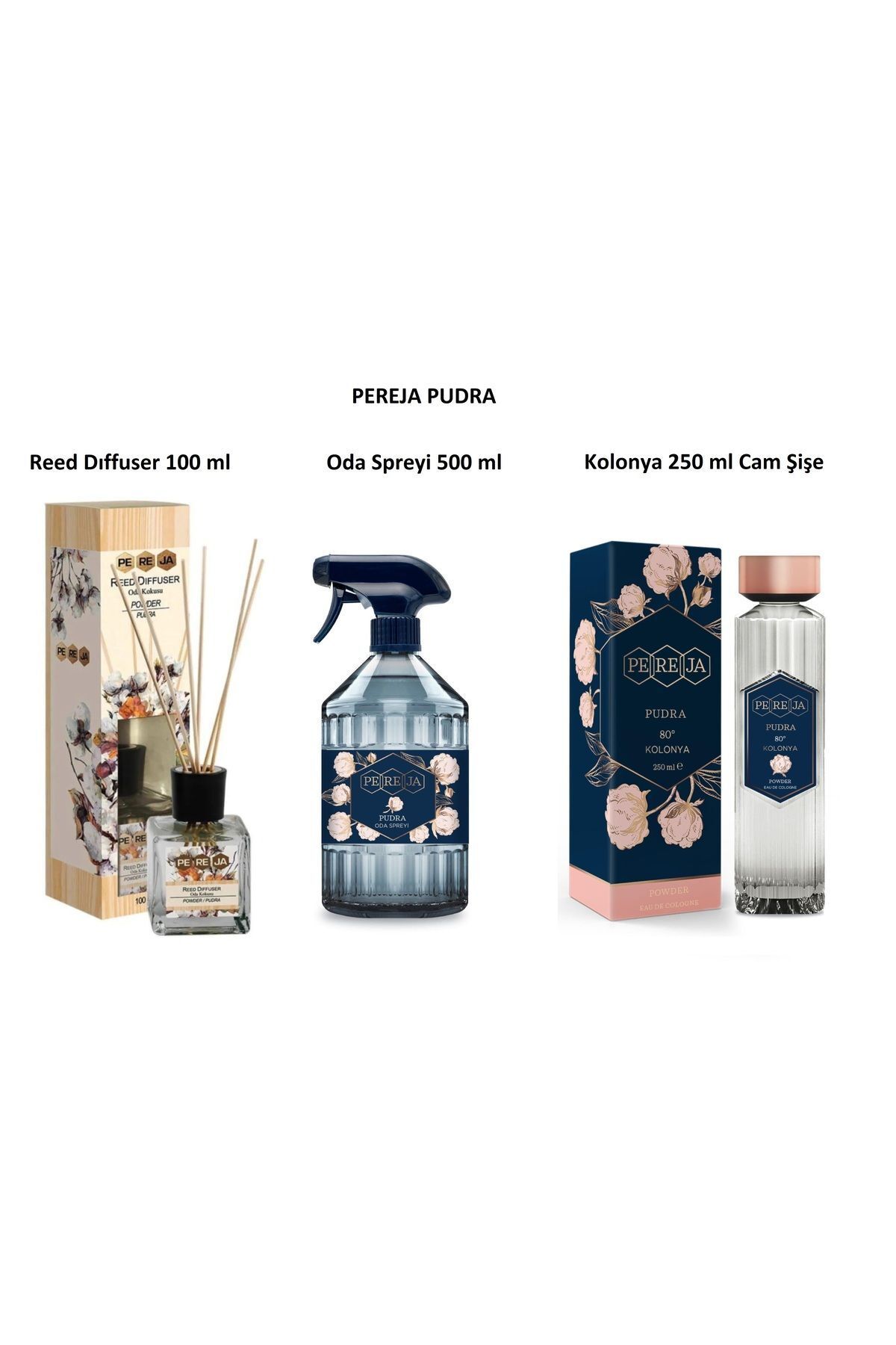 Pudra Koku Serisi Kolonya cam Şişe 250 ml Sprey, Oda Kokusu 500 ml, Çubuklu Oda Kokusu 100 ml