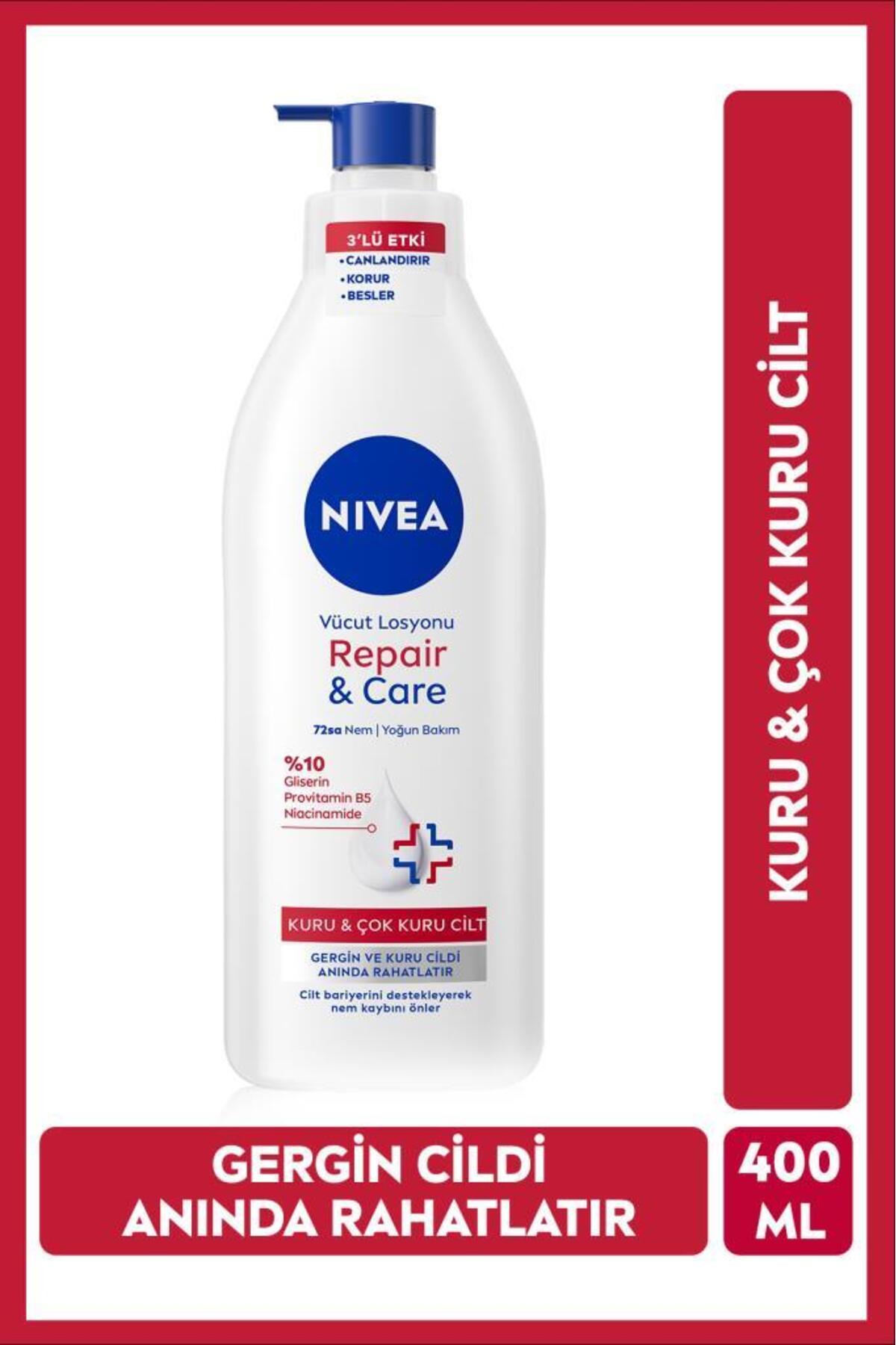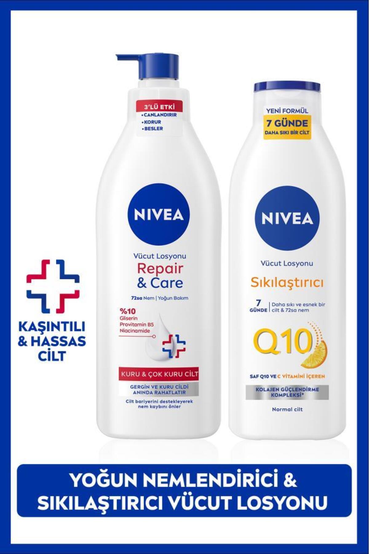 • 110 Yılı Aşkın Cilt Bakım Uzmanı NIVEA’dan! • 1-NIVEA Repair&Care Yoğun Nemlendirici Vücut Losyonu 400ml: Gergin ve kuru cildi anında rahatlatır.; • Cildinizi 72 saat boyunca derinlemesine ve yoğun bir şekilde nemlendirir.; • Kaşıntıyı anında rahatlatır.; • Cilt bariyerini destekler ve ciltteki nem kaybını dengeler.; • Hızlı emilen yoğun formülü sayesinde vücutta yağlı ve yapışkan his bırakmaz.; • İçerik: Provitamin B5, Niacinamide.; • Hangi Cilt Tipleri İçin Uygundur?: Özellikle kuru ve çok kuru cilt tipleri için özel olarak geliştirilmiştir.; • 2- NIVEA Q10 Sıkılaştırıcı Vücut Losyonu 250ml: İçeriğindeki Q10 ve C vitamini ile geliştirilmiş formulü sayesinde cilt 7 günde gözle görülür derece sıkılaşmasına ve esnekliğinin artmasını sağlar.; • 48 Saat Nemlendirme: Hızlı emilen vücut losyonu ile 48 saat boyunca yoğun nemlendirme sağlar.; • Hafif formülü sayesinde cildiniz tarafından hızla emilir ve cildinizde yağlı, yapışkan his bırakmaz.; • İçeriğindeki kolajen güçlendirici kompleks sayesinde daha sıkı bir cilt görünümü sağlar.; • C Vitamini içeriği ile daha canlı bir cilt görünümü sunar.; • Yalnızca vücut için uygundur, yüz için uygun değildir.; • NIVEA tarafından 1 adet sıkılaştırıcı losyon ve 1 adet yoğun nemlendirici losyon olarak gönderilecektir.