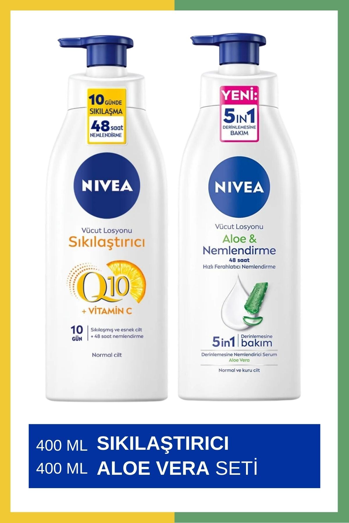 Türkiye’nin en sevilen El ve Vücut bakım markası NIVEA’dan NIVEA Q10 Sıkılaştırıcı Vücut Losyonu 400 ml Avantajlı Boy ile sıkı ve elastik bir cilde hazır mısın? ; NIVEA Q10 Sıkılaştırıcı Vücut Losyonu ile sıkı ve elastik bir cilt 10 Günde Sıkılaşma: İçeriğindeki Q10 ve C vitamini ile geliştirilmiş formülü sayesinde cilt 10 günde gözle görülür derece sıkılaşmasına ve esnekliğinin artmasını sağlar ; 48 Saat Nemlendirme: Hızlı emilen vücut losyonu ile 48 saat boyunca yoğun nemlendirme sağlar ; Ciltle uyumu dermatolojik olarak onaylanmıştır ; Tüm ciltler için uygundur. ; Pompalı başlığı sayesinde kolay uygulanır. ; En iyi sonuç için, NIVEA vücut losyonunu günlük kullanımda tüm vücudunuza nazikçe yayın ve masaj yaparak uygulayın-uygulama sırasında kayıp düşmemeye dikkat edin. ; Uygulama sırasında masaj yapın ; NIVEA Bakım Güvencemiz: 100 yıllık cilt bakım uzmanlığımız ile EN yüksek kalite standartlarına sahip içerikleri seçiyoruz ; Türkiye’nin en sevilen el ve vücut bakım markası NIVEA’dan NIVEA Aloe Vera Vücut Losyonu NIVEA DERİNLEMESİNE* NEMLENDİRİCİ SERUM ve aloe vera içerir. (*epidermisin üst tabakasına) 48 Saat derinlemesine nemlendirme : Formül nemi derinlemesine cilde hapseder ve cilde 48 saat boyunca fark edilir yumuşaklık sağlar. ; NIVEA vücut losyonu anında emilir ve bir kullanımda bile cildinizi rahatlatır, ferahlatır ve hoş kokmasını sağlar. ; Nemlendirici SERUM ve aloe vera içerir. ; Normal ve Kuru cilt tipleri için uygundur ; Ciltle uyumu dermatolojik olarak onaylanmıştır. ; Tüm içerikler yüksek kalite standartlarına göre seçilmiştir. ; 100 yıllık cilt bakım uzmanlığı ; Nasıl kullanılır?: NIVEA Aloe vera vücut losyonu 400ml günlük kullanımda tüm vücudunuza nazikçe yayın ve masaj yaparak uygulayın-uygulama sırasında kayıp düşmemeye dikkat edin. ; Almanya’da üretilmiştir ; ;
