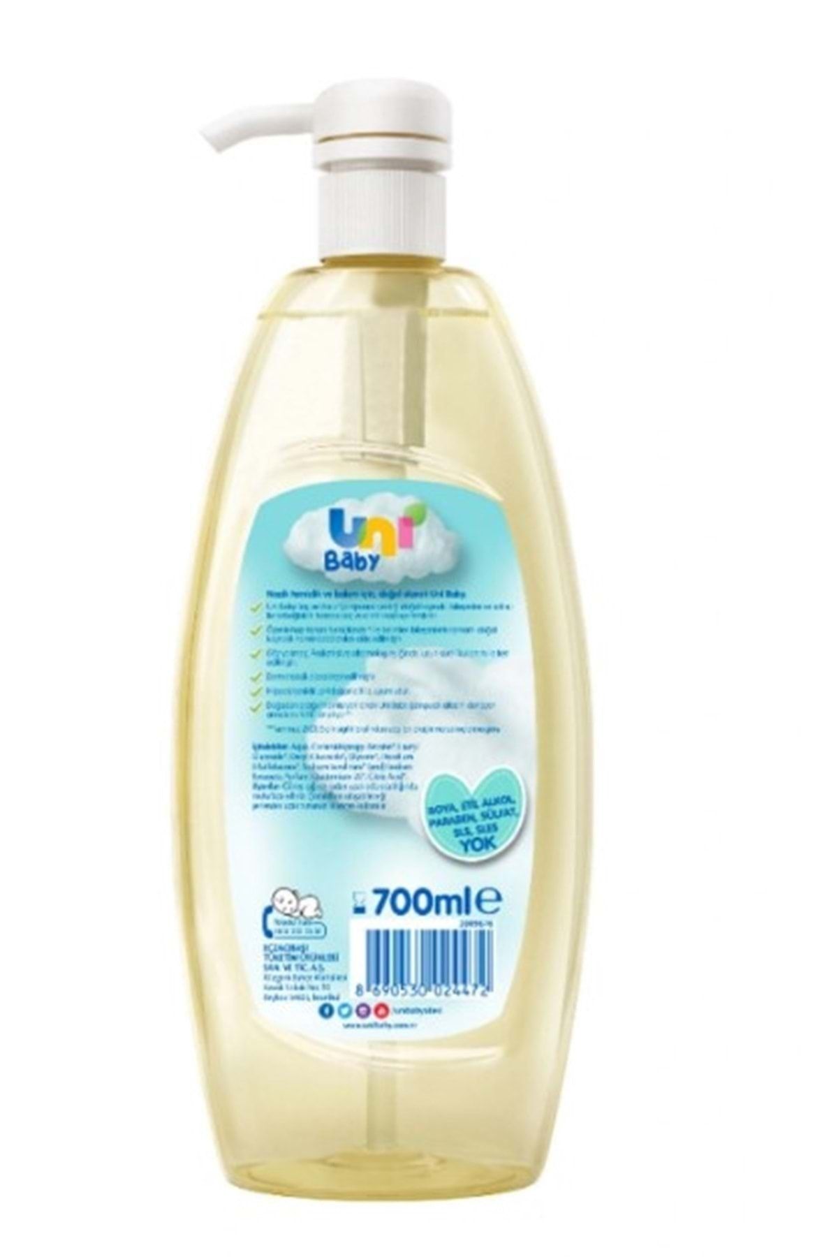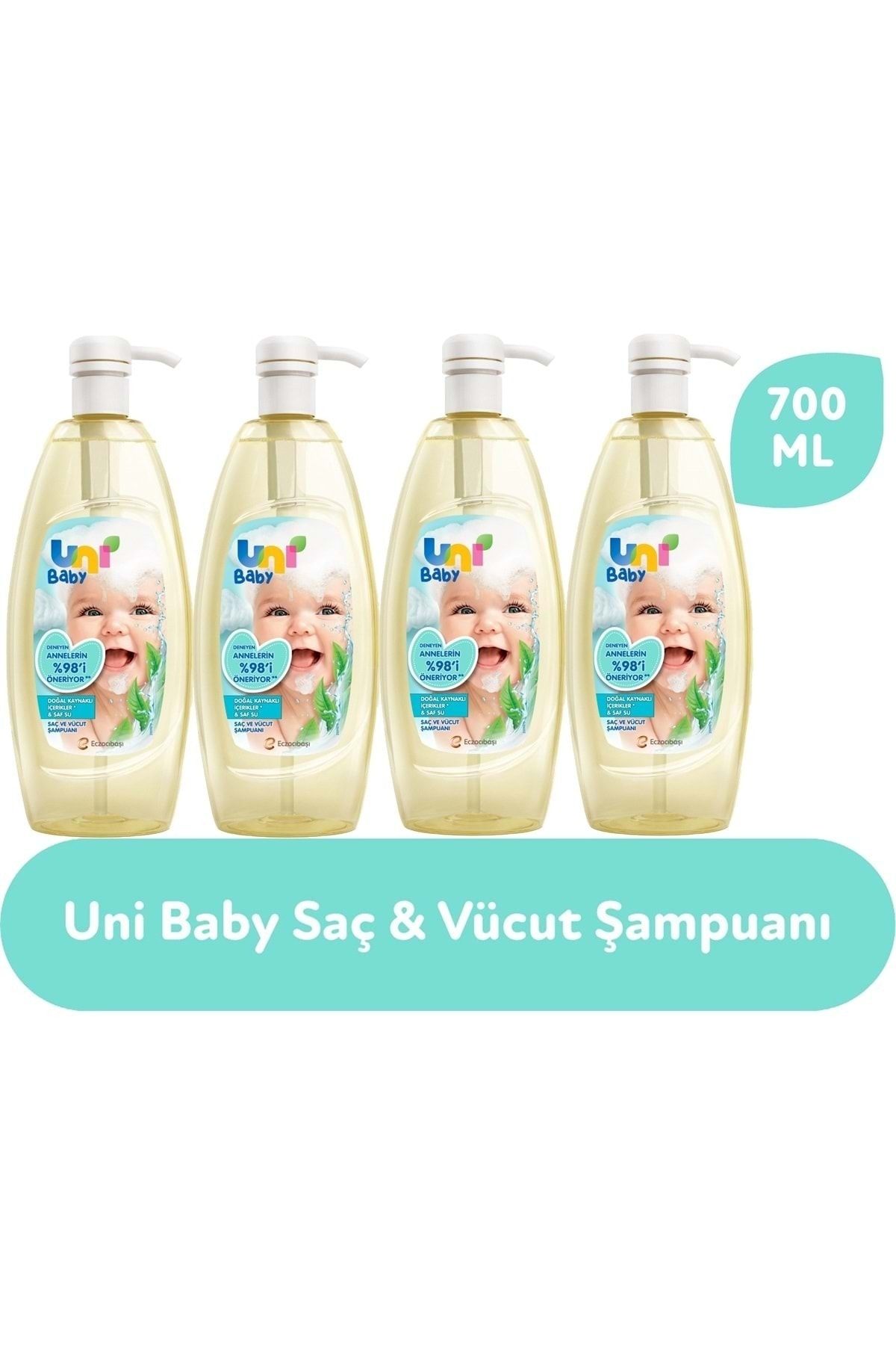 Uni Baby Saç ve Vücut Şampuan 700ML (Pompalı) (4 Lü Set) Özellikleri: Boya içermeyen ve göz yakmayan özel formülü ile Uni Baby Boyasız Şampuan güvenli temizlik sağlar ve saçları yumuşacık yapar. ; Bebeğinizin saç ve saç derisini besler, yapılandırır ve canlandırır. ; Uni Baby Şampuan, bebekleriniz için özel olarak geliştirilmiş formülü ile göz yakmaz. ; Boya içermeyen ve göz yakmayan özel formüle sahiptir. ; Bebeğinizin saç ve saç derisini besler, yapılandırır ve canlandırır. ; Bebeğinizin banyosu sırasında, saç ve vücut temizliği için güvenle kullanılır. ; Avrupa Birliği Standartlarına uygun üretim prosedürüyle ürün hazırlayan Uni Baby saf içerikli doğru formüllerle anneleri huzurlu, bebekleri mutlu etmeye devam ediyor. ; pH değeri bebeğinizin cildi ile uyumludur. ; Alerjik reaksiyona neden olan maddeler içermez. ; Günlük kullanıma uygundur. ; Dermatolojik olarak test edilmiştir. ; Hipoalerjeniktir. ; Alkol, Paraben, SLS/SLES, Boya içermez. ; Neden Uni Baby? Bebeğiniz için ilk günden itibaren güvenle kullanabileceğiniz ürünler sunar. ; Yenidoğan cildi farklıdır: Yenidoğan bebeklerin cildi çok hassas ve incedir. ; Onları koruyan Verniks tabakası ile doğarlar. ; Verniks tabakası bebeğin vücut ısısını dengede tutarak, dış etkenlere karşı korur. ; Verniks?e zarar gelmemesi için yenidoğan cildi için kullanılacak ürünlerin özenle seçilmesi gerekir. ; Yenidoğan cildi için su ve pamuk: Yenidoğanların ince ve hassas cildinin temizliği için, su ve pamuk kullanımı önerilmektedir. ; Böylece onu dış etkenlere karşı koruyan ve geçirgen olan cildinin kimyasallardan korunması amaçlanmaktadır. ; İlk günden itibaren Uni Baby Yenidoğan serisi: Uni Baby, yenidoğan bebeklerin cilt hassasiyetlerini ve özelliklerini iyi bilerek onlara özel ürünler geliştirir. ; Uni Baby güvenli ürün formülleri: Güncel araştırma ve literatürlerin sürekli takip edilmesi sonucu Uni Baby ürün formüllerinde bebeklere uygun içerikler kullanılmaktadır. ; Uni Baby ürünleri, alkol, paraben, boya, SLS/SLES içermemektedir, güvenle kullanılır.;