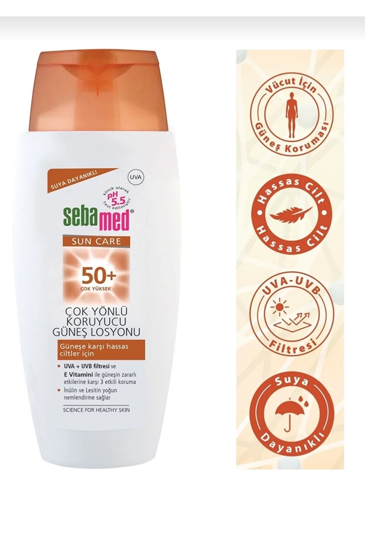 Sebamed Çok Yönlü Koruyucu Güneş Losyonu 50+ Faktör 150 ml Özellikleri:Güneş ışınlarına bağlı cilt hasarı ve tahrişi önleyen mikro pigmentlerle kombine edilmiş etkin UVA/UVB filtre sistemiyle güvenilir UVA + UVB koruma sağlar.5.5 pH değerindedir.Cildi yaşlanma etkilerine karşı korur.Güneşe maruz kalan cildi yumuşatır, pürüzsüzleştirir ve cildin esnekliğini korur.Güneşin neden olduğu pigmentasyon lekelerine ve erken yaşlanma belirtilerine karşı koruma sağlar.6saate kadar su ve tere karşı dayanıklılığını sürdürür, kuma dayanıklıdır.Kolay uygulanır, yağ içermez, beyaz kalıntı bırakmaz.Doğal Hydro Fruktol formülü, E vitamini, d-pantenol içerir.Güneş yanığına karşı cildi korur.Güneşin oluşturduğu hasar ve yaşlanmaya karşı cildi korur.Çok hassas ciltler ve güneşe dayanıksız ciltler ile çocuklar için uygundur.Kumsalda, spor yaparken ve kentte kullanıma uygundur.Dermatolojik ve klinik olarak test edilmiştir.Paraben içermez.Sebamed Çok Yönlü Koruyucu Güneş Losyonu 50 Faktör 150 mlBileşenleri: Aqua, Octocrylene, Dibutyl Adipate, Titanium Dioxide (Nano), C12-15 Alkyl Benzoate, Butyl Methoxydibenzoylmethane, Glycerin, DiethylaminoHydroxybenzoyl Hexyl Benzoate, Dimethicone, VP/Eicosene Copolymer, Microcrystalline Cellulose, Panthenol, Tocopheryl Acetate, Lauryl Glucoside, Polyglyceryl-2 Dipolyhydroxystearate, Diethylhexyl Butamido Triazone, Inulin, Lecithin, Bisabolol, Sodium Cetearyl Sulfate, Silica, Bis-Ethylhexyloxyphenol Methoxyphenyl Triazine, Cellulose Gum, Xanthan Gum, Disodium EDTA, Citric Acid, Sodium Hydroxide, Parfum, Benzyl Alcohol, Dehydroacetic Acid, Ethylhexylglycerin, Phenoxyethanol, Sorbic Acid.; Bu ilan BizimHesap.com ile yayınlanmıştır.