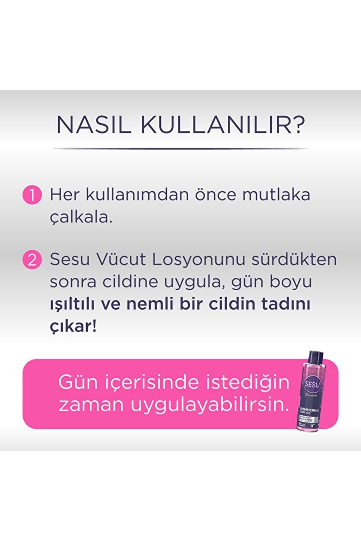 Sesu Simli Cilt Bakım Yağı 150ML (Shımmering Body Oıl) (2 Li Set) CİLT BAKIM RİTÜELİNDE ÜÇÜNCÜ ADIM: SESU SİMLİ VÜCUT YAĞI 150 ML Herkesin büyük bir heyecanla oluşturduğu ve yanına tik atmak için sabırsızlandığı bir #WishList ’i vardır.; Senin #WishList ’inde yerini alacak ve cilt bakım ritüelini oluşturmana yardımcı olacak yeni Sesu Premium Skincare serisi ile tanışmaya hazır mısın? Üçüncü adım: Sesu Simli Vücut Yağı, gel birlikte keşfedelim! İçeriğindeki E Vitamini ve Hindistan cevizi yağı ile cildi derinlemesine nemlendirir ve bakım yapar.; Canlı, aydınlık ve pürüzsüz bir cilt görünümü sağlar.; Kolay emilir.; Bubblegum kokuludur.