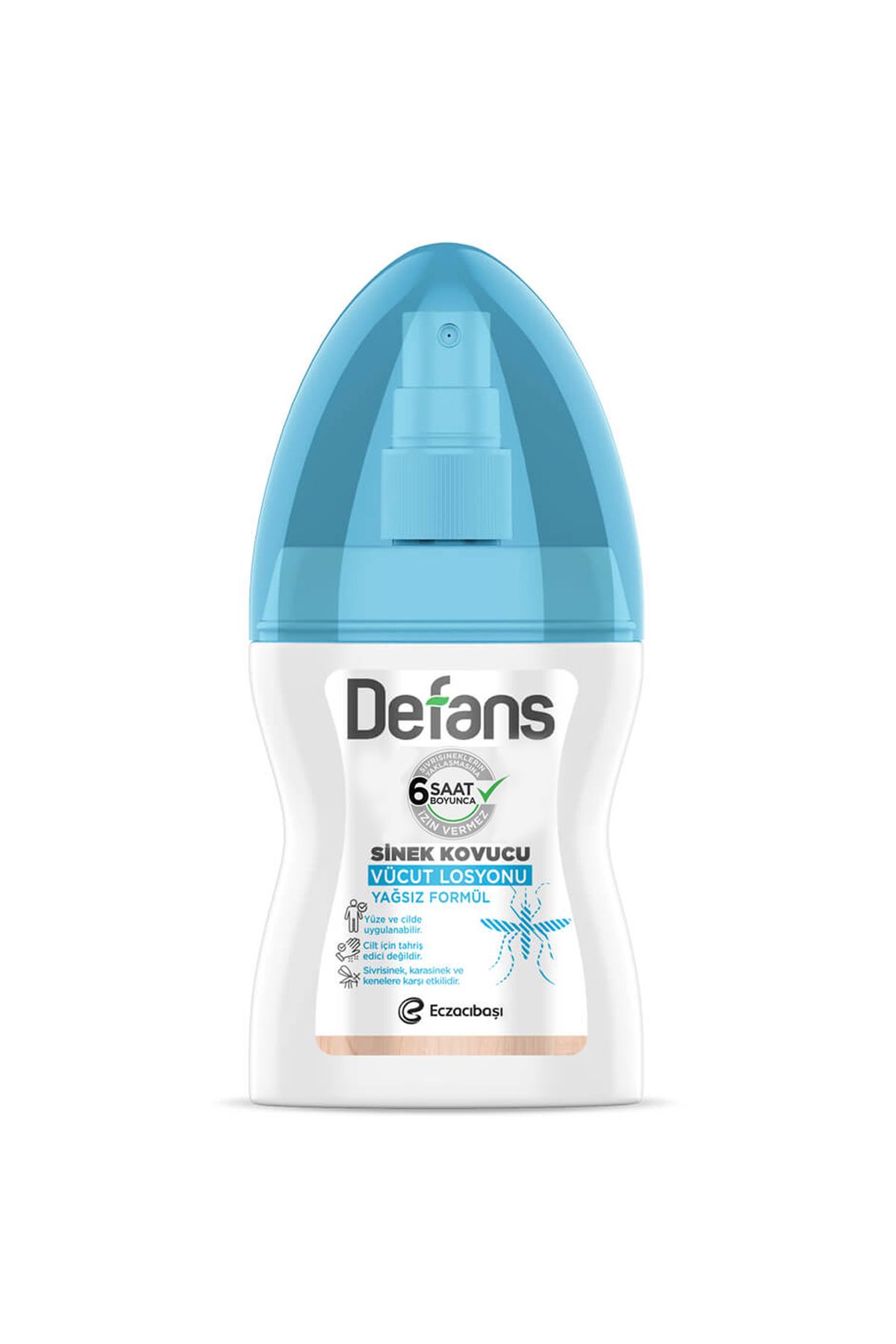 Defans Sinek Kovucu Vücut Losyonu 100 ml Yağsız Formül ÜRÜN ÖZELLİKLERİ Defans Sinek Kovucu Vücut Losyonu Yağsız Formül Cildinizi Ağırlaştırmayan Yağsız Formül!Yağsız formülü sayesinde sizi sivrisinek, karasinek ve kenelerden uzak tutarken aynı zamanda cildinizi ağırlaştırmadan koruma sağlar. Açık havada Defans Sinek Kovucu Vücut Losyonu Yağsız Formül rahatça kullanılabilir. Yüze ve tüm cilde uygulanabilir. Cilt için tahriş edici değildir.Etki süresi karasineklerde 4 saat, sivrisineklerde 6 saat ve kenelerde 2 saattir.Ciltten emilmeyen özel yağsız formülü bulunmaktadır. Üretici Firma: Coster Aerosol Valf Sanayi A.ş.