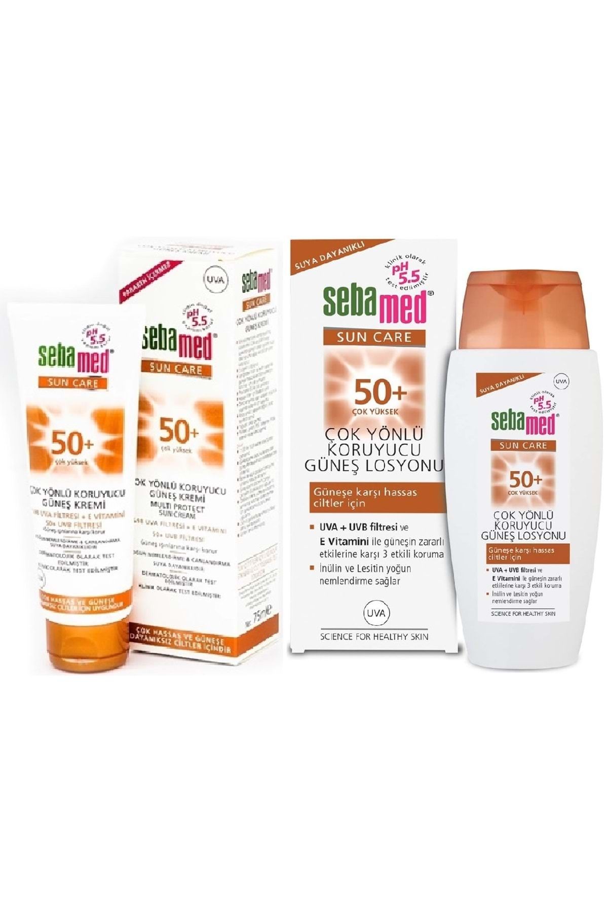 Sebamed Sun Care Çok Yönlü Koruyucu Güneş Kremi Avantaj Pk (75ML SPF 50+ Faktör + 150ML 50+ Faktör) Sebamed Sun Care Çok Yönlü Koruyucu Güneş Kremi 75ML SPF 50+ Faktör Sebamed Sun Care Çok Yönlü Koruyucu Güneş Losyonu 50+ Faktör 150ML Özellikleri: Güneş ışınlarına bağlı cilt hasarı ve tahrişi önleyen mikro pigmentlerle kombine edilmiş etkin UVA/UVB filtre sistemiyle güvenilir UVA + UVB koruma sağlar. 5.5 pH değerindedir. Cildi yaşlanma etkilerine karşı korur. Güneşe maruz kalan cildi yumuşatır, pürüzsüzleştirir ve cildin esnekliğini korur. Güneşin neden olduğu pigmentasyon lekelerine ve erken yaşlanma belirtilerine karşı koruma sağlar. 6saate kadar su ve tere karşı dayanıklılığını sürdürür, kuma dayanıklıdır. Kolay uygulanır, yağ içermez, beyaz kalıntı bırakmaz. Doğal Hydro Fruktol formülü, E vitamini, d-pantenol içerir. Güneş yanığına karşı cildi korur. Güneşin oluşturduğu hasar ve yaşlanmaya karşı cildi korur. Çok hassas ciltler ve güneşe dayanıksız ciltler ile çocuklar için uygundur. Kumsalda, spor yaparken ve kentte kullanıma uygundur. Dermatolojik ve klinik olarak test edilmiştir. Paraben içermez. Sebamed Çok Yönlü Koruyucu Güneş Losyonu 50 Faktör 150 ml Bileşenleri: Aqua, Octocrylene, Dibutyl Adipate, Titanium Dioxide (Nano), C12-15 Alkyl Benzoate, Butyl Methoxydibenzoylmethane, Glycerin, DiethylaminoHydroxybenzoyl Hexyl Benzoate, Dimethicone, VP/Eicosene Copolymer, Microcrystalline Cellulose, Panthenol, Tocopheryl Acetate, Lauryl Glucoside, Polyglyceryl-2 Dipolyhydroxystearate, Diethylhexyl Butamido Triazone, Inulin, Lecithin, Bisabolol, Sodium Cetearyl Sulfate, Silica, Bis-Ethylhexyloxyphenol Methoxyphenyl Triazine, Cellulose Gum, Xanthan Gum, Disodium EDTA, Citric Acid, Sodium Hydroxide, Parfum, Benzyl Alcohol, Dehydroacetic Acid, Ethylhexylglycerin, Phenoxyethanol, Sorbic Acid.