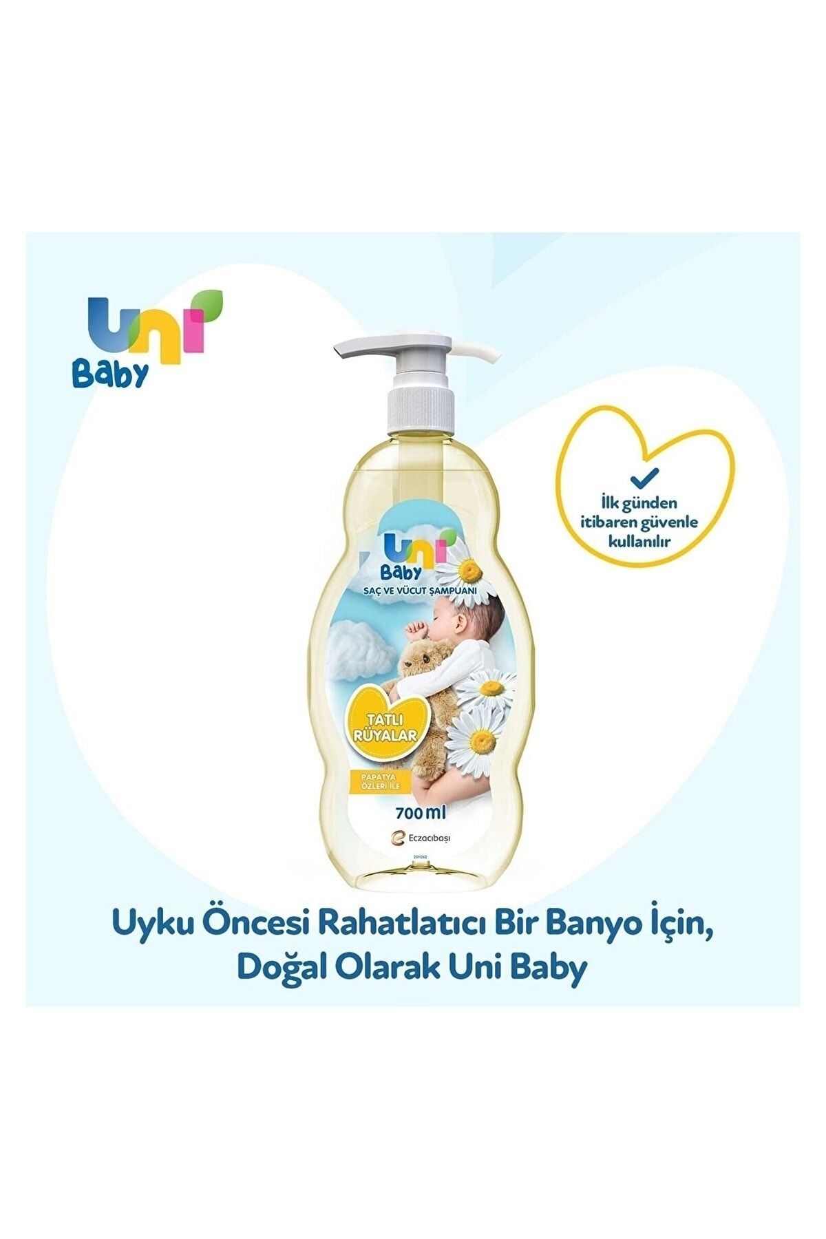 • Uni Baby Tatlı Rüyalar Saç ve Vücut şampuanı papatya özleri içerir. ; • Uyku öncesi rahatlatıcı bir banyo bebeğinizin huzurla uyumasına yardımcı olur. ; • İçerdiği doğal kaynaklı bileşenler ve saf su ile bebeğinizin hassas saç ve cildini nazikçe temizler. ; • Göz yakmaz. ; Pediatrist ve oftalmolog eşliğinde, uzun süreli kullanım ile test edilmiştir. ; • Dermatolojik olarak test edilmiştir. ; • Hipoalerjeniktir. ; pH değeri cilt ile uyumludur.;