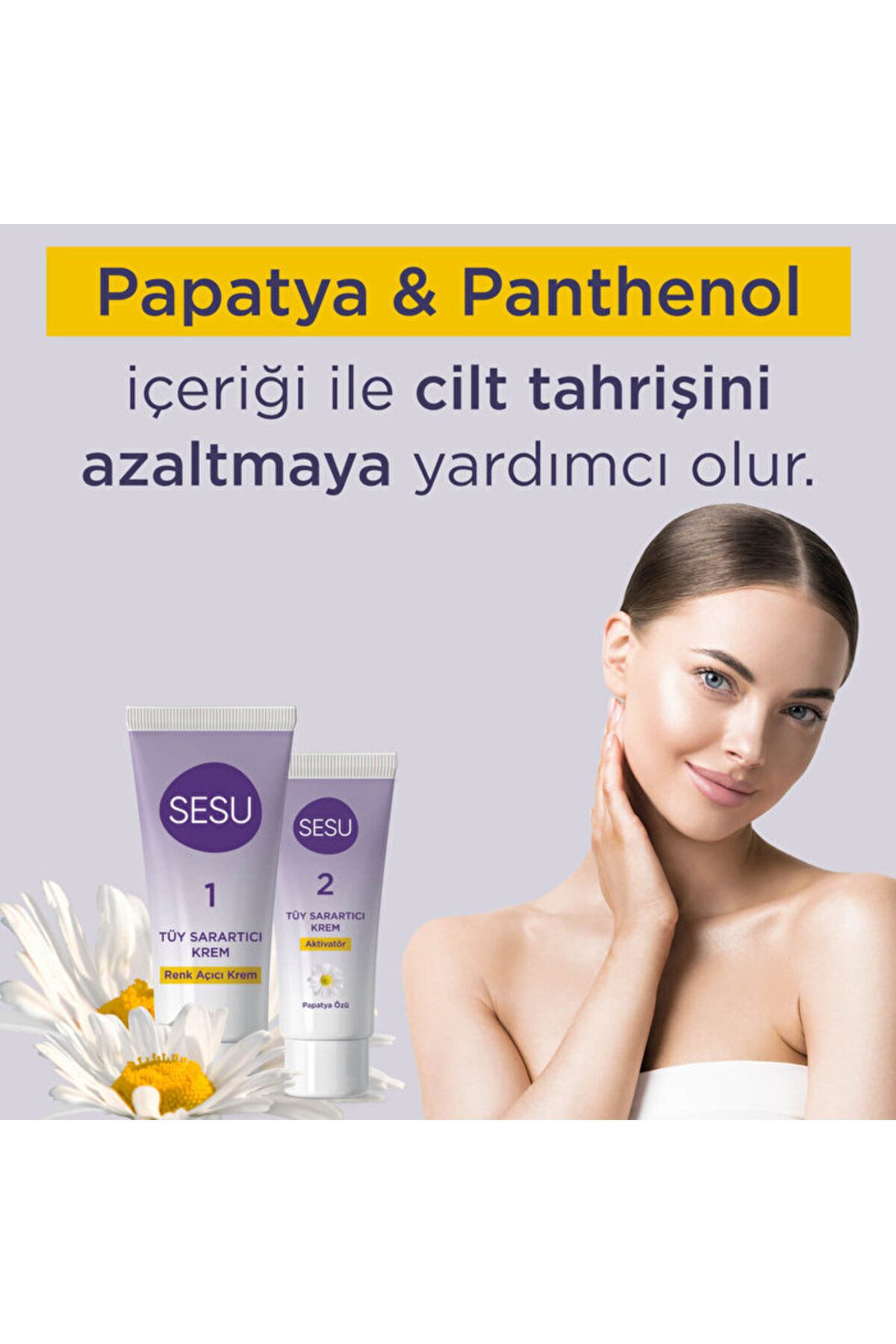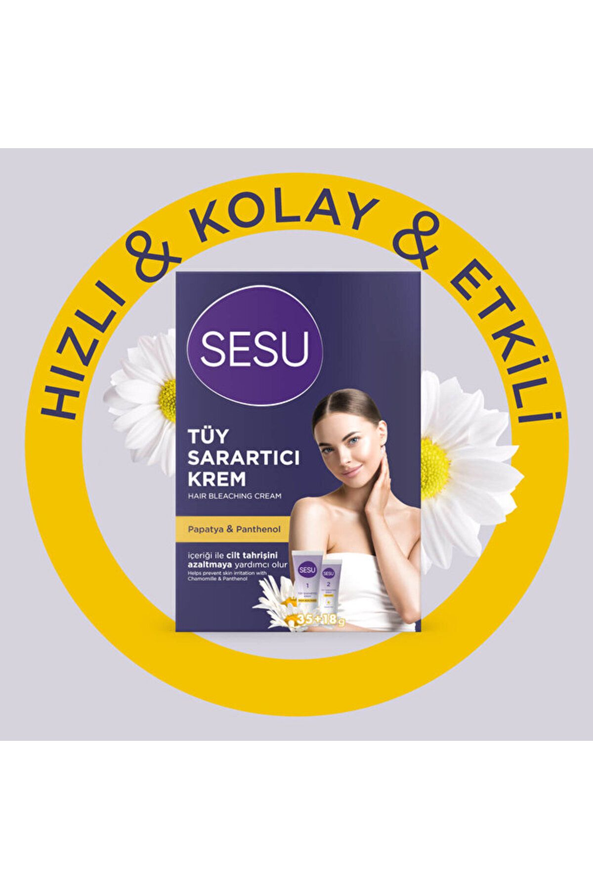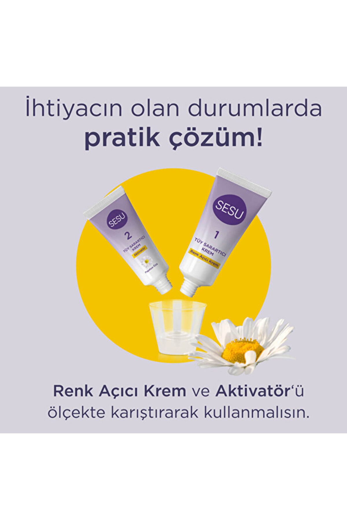 Sesu Tüy Sarartıcı krem, acil durumlarda tüylerin güçlenmeden sararmasına yardımcı olur, hızlı ve pratik bir çözüm sağlar.; Özel formüllü Sesu Tüy Sarartıcı Krem, içeriğindeki papatya özü ve panthenol sayesinde cildinde oluşabilecek tahrişin azalmasına yardımcı olur.; -Hızlıdır, kullanımı kolaydır.; -Panthenol ve papatya özü içerdiği için ciltte oluşabilecek tahrişin azalmasına yardımcı olur.